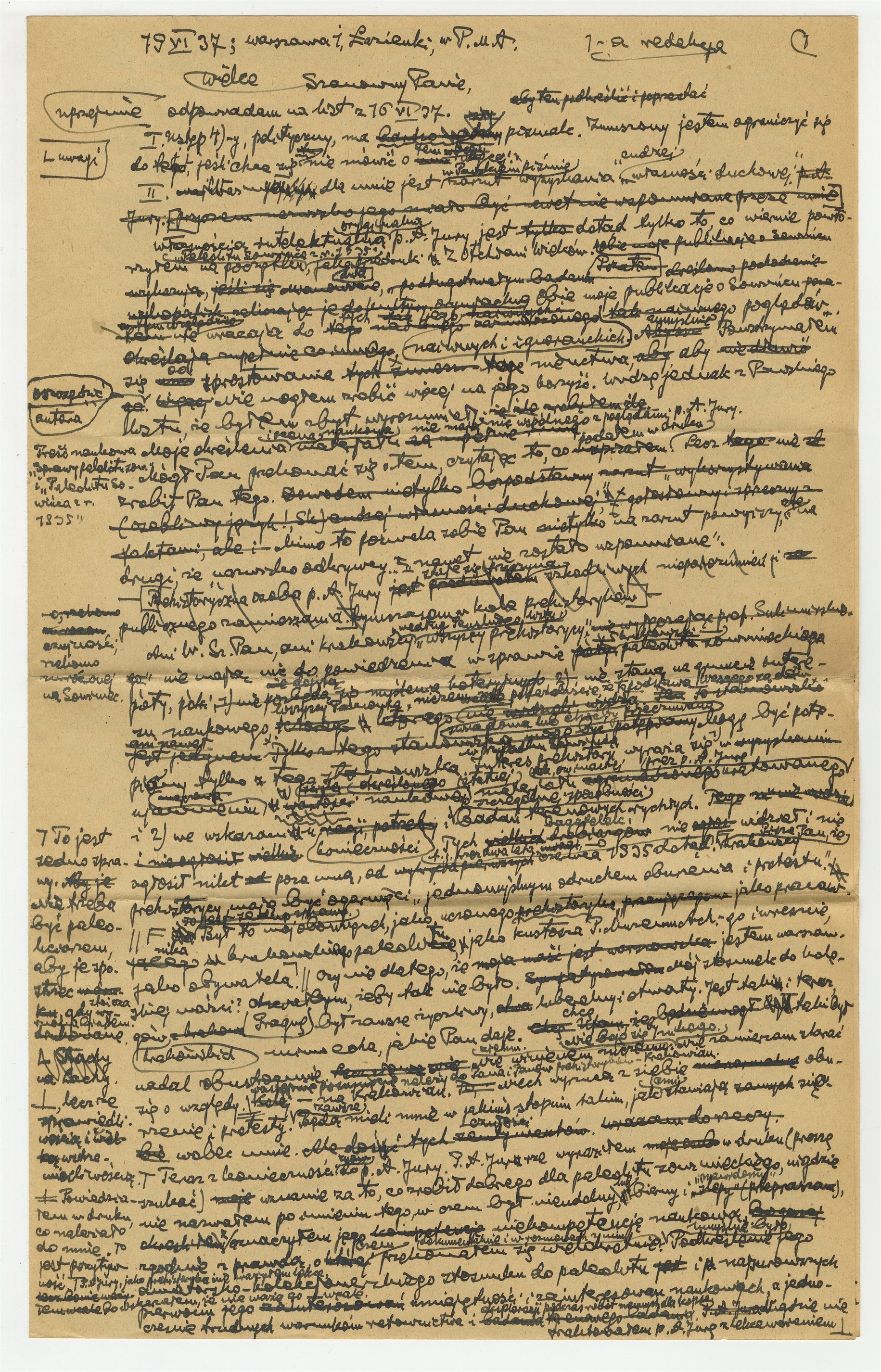 Rękopis - brudnopis listu Stefana Krukowskiego z dnia 19 VI[19]37 roku do prof. J. Kostrzewskiego (pierwsza redakcja listu) - strona 1
