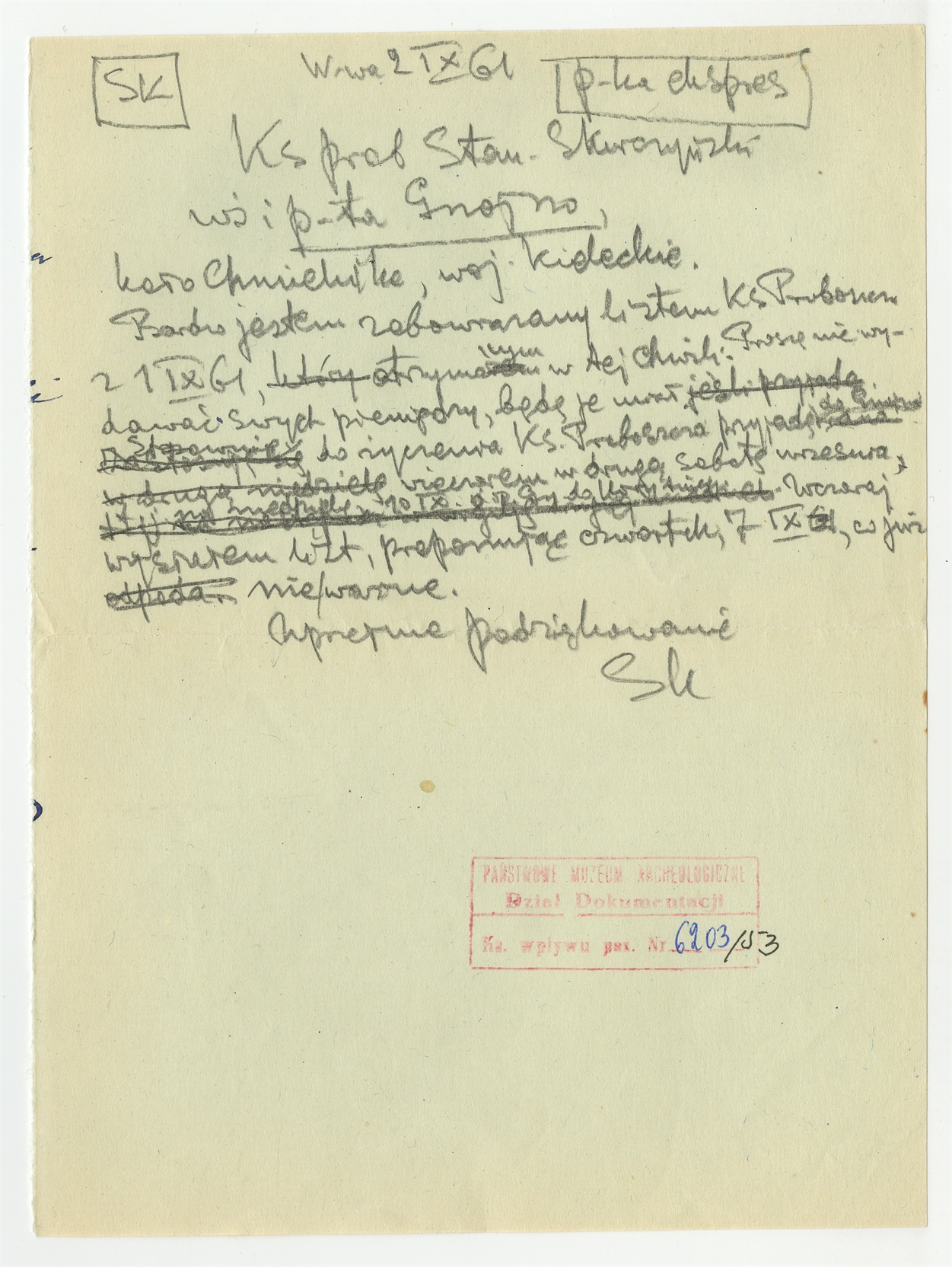 Rękopis - brudnopis listu Stefana Krukowskiego z dnia 2 IX [19]61 roku do Stanisława Skurczyńskiego