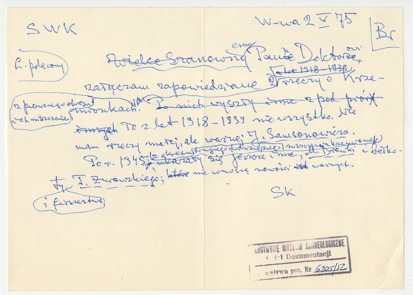 Rękopis - brudnopis listu Stefana Krukowskiego z dnia 2 V [19]75 roku do Antoniego Nowakowskiego