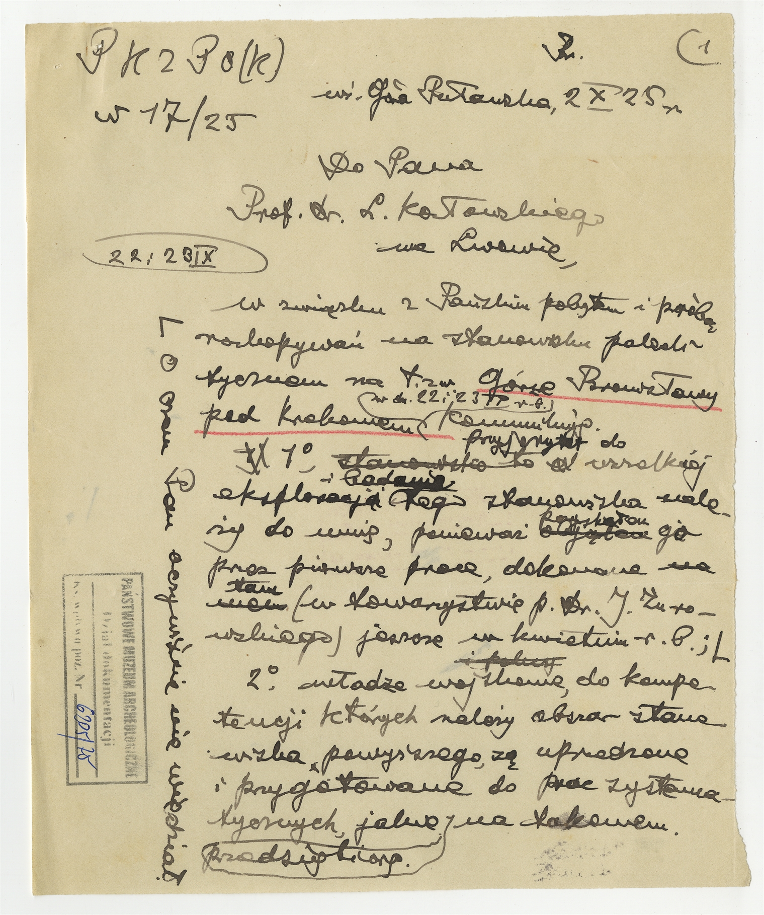 Rękopis - brudnopis listu Stefana Krukowskiego z dnia 2 X [19]25 roku do prof. L. Kozłowskiego - strona 1