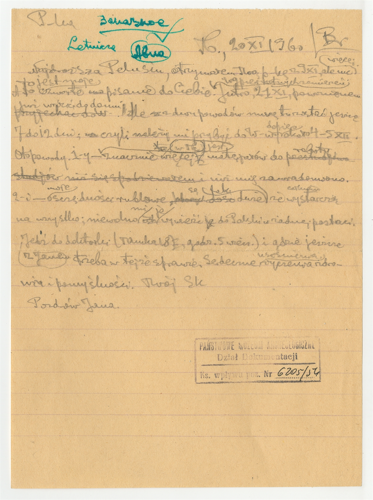 Rękopis - brudnopis listu Stefana Krukowskiego z dnia 20 XI 1960 roku do Pelagii Krukowskiej