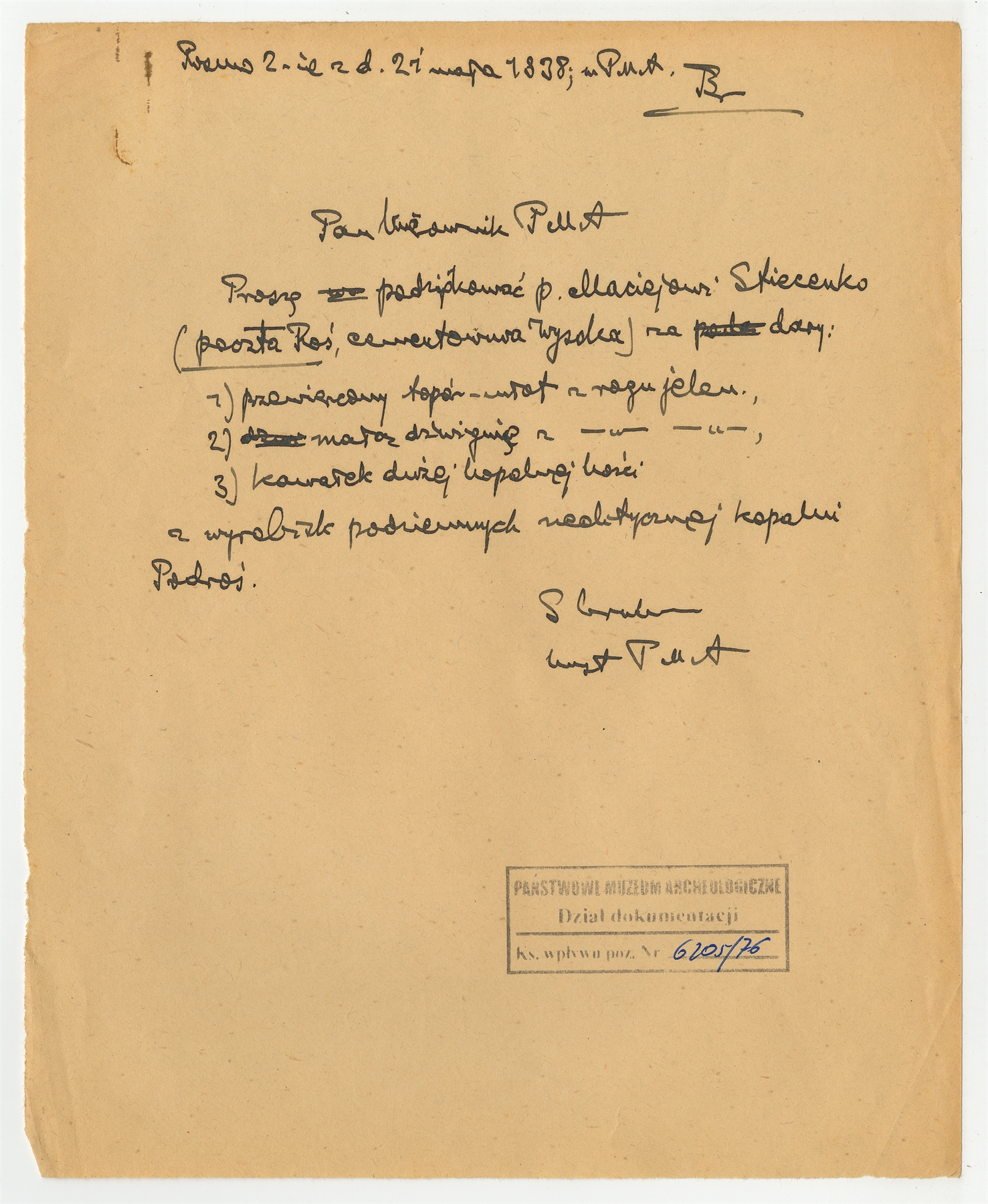 Rękopis - brudnopis listu Stefana Krukowskiego z dnia 21 maja 1938 roku do kierownika Państwowego Muzeum Archeologicznego