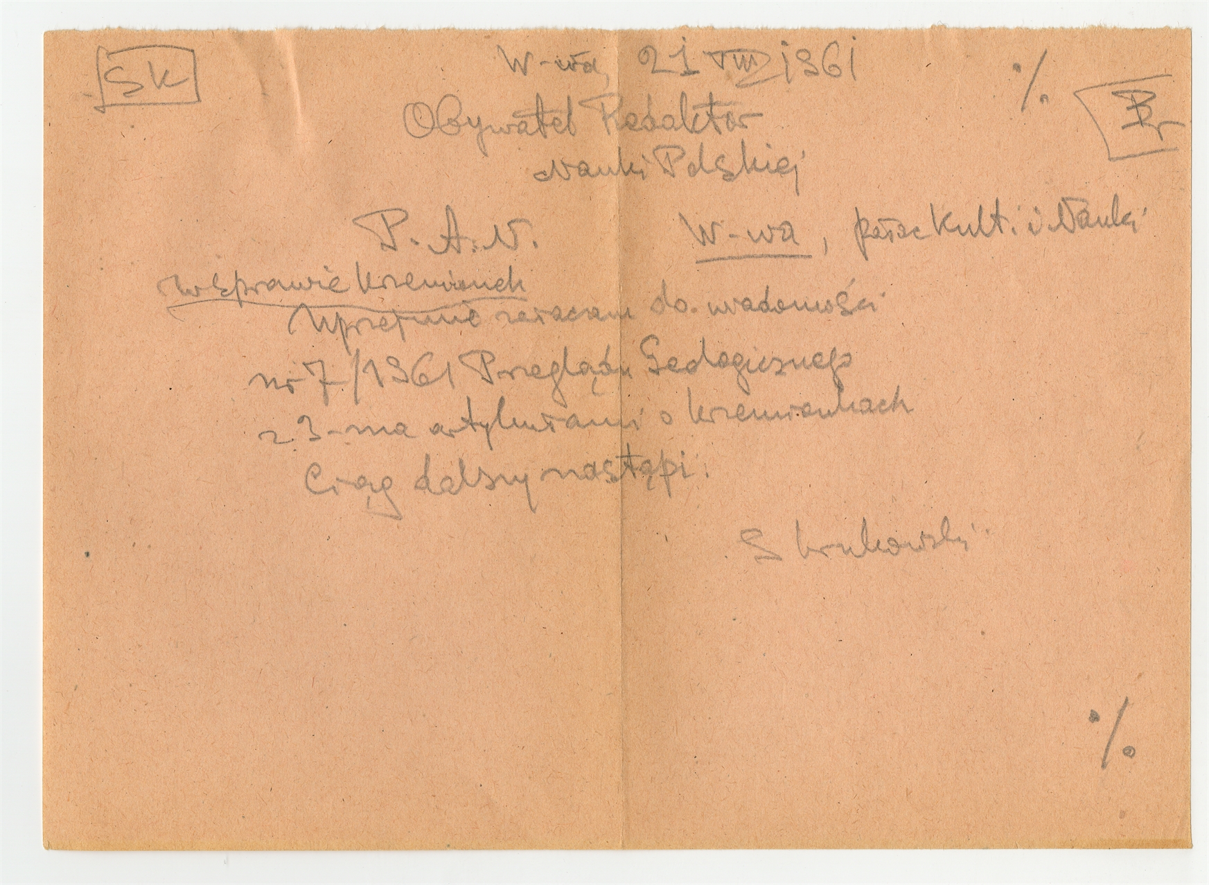 Rękopis - brudnopis listu Stefana Krukowskiego z dnia 21 VIII 1961 roku do Redaktora Nauki Polskiej