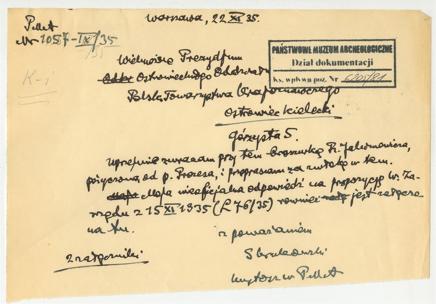 Rękopis - brudnopis listu Stefana Krukowskiego z dnia 22 XI [19]35 roku do Prezydium Ostrowieckiego Oddziału Polskiego Towarzystwa Krajoznawczego