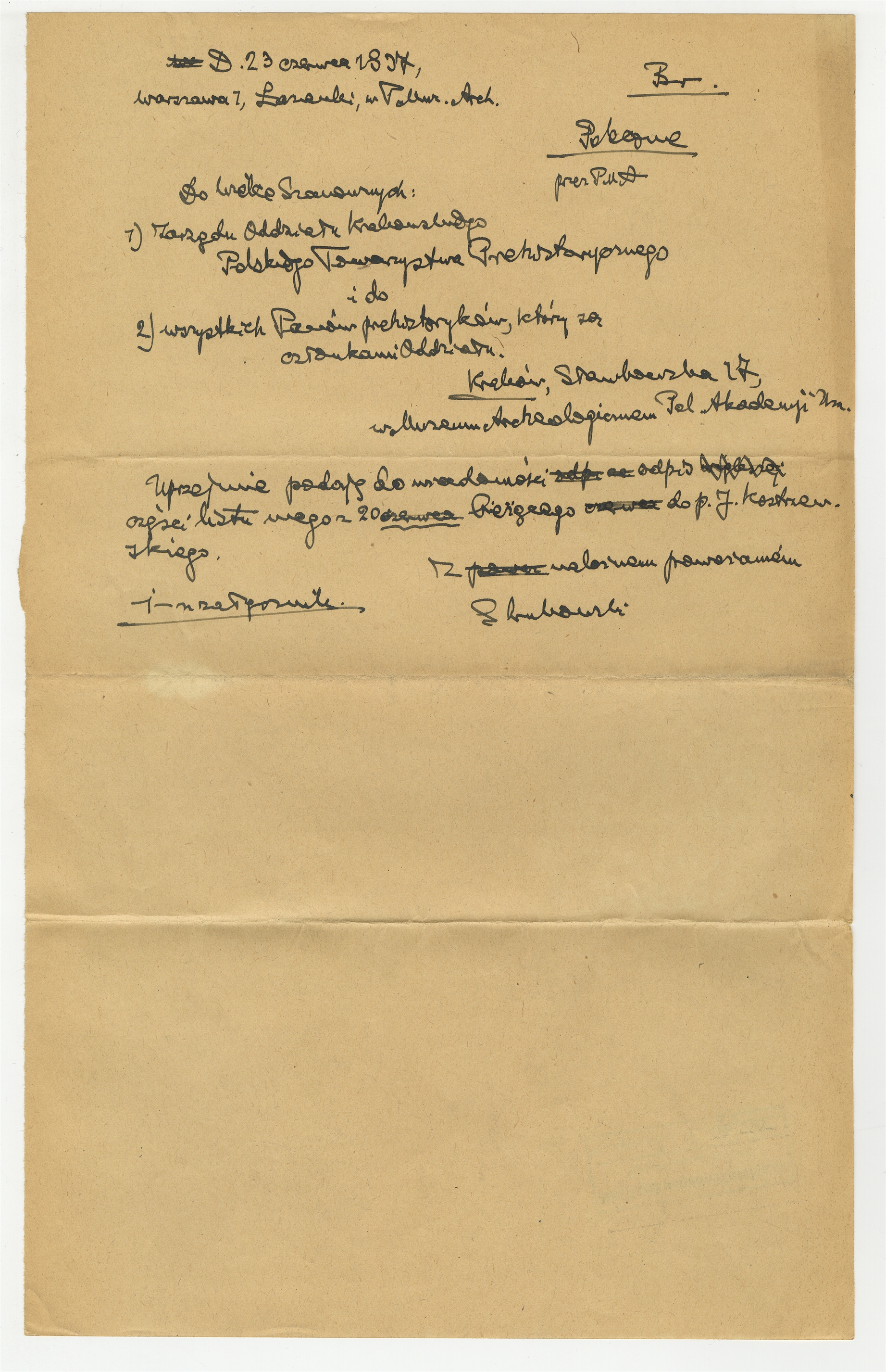 Rękopis - brudnopis listu Stefana Krukowskiego z dnia 23 czerwca 1937 roku do Zarządu Oddziału Krakowskiego Polskiego Towarzystwa Prehistorycznego