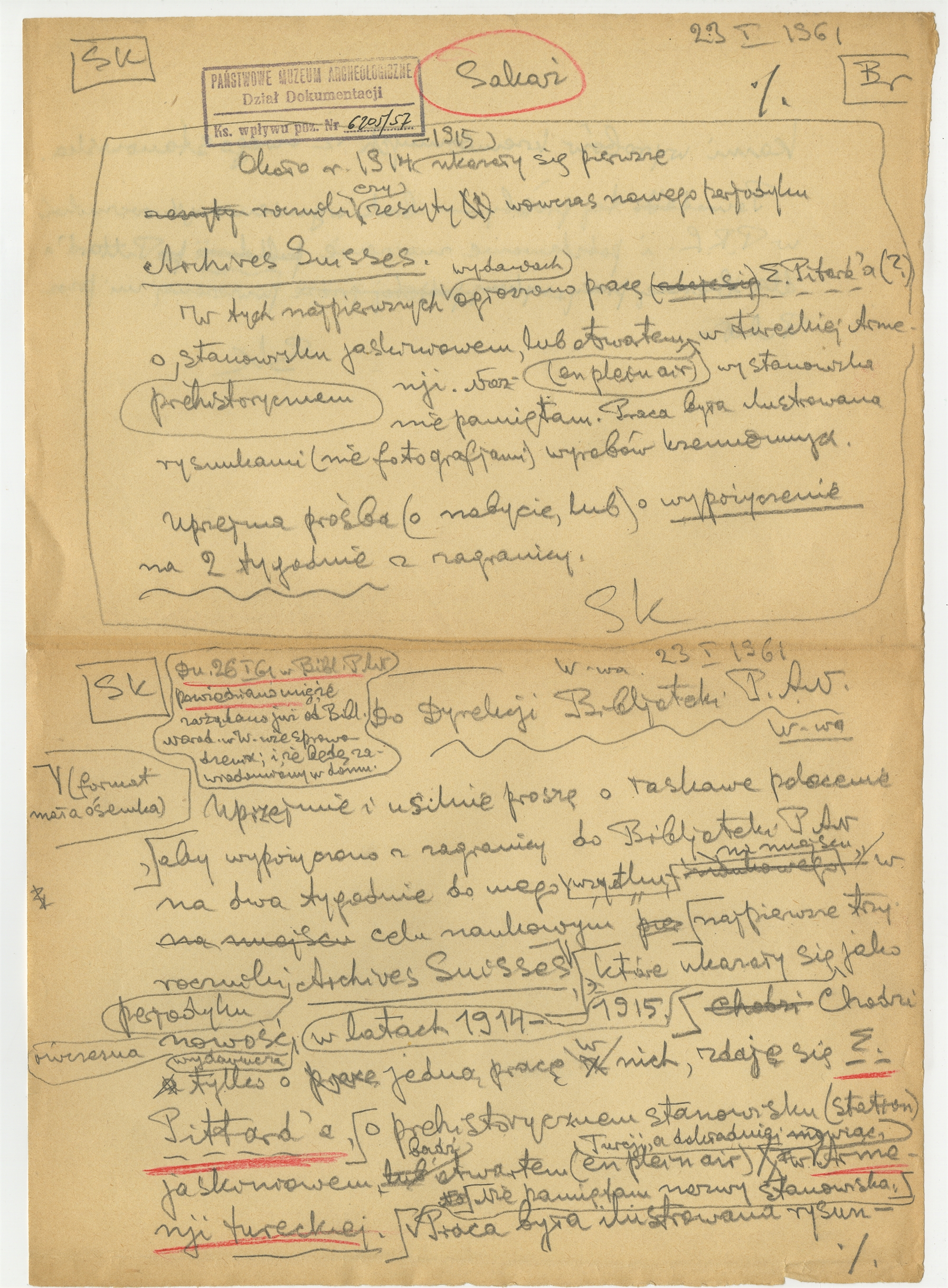 Rękopis - brudnopis listu Stefana Krukowskiego z dnia 23 I 1961 roku do Dyrekcji Biblioteki PAN z prośbą o sprowadzenie periodyku Archives Suisses