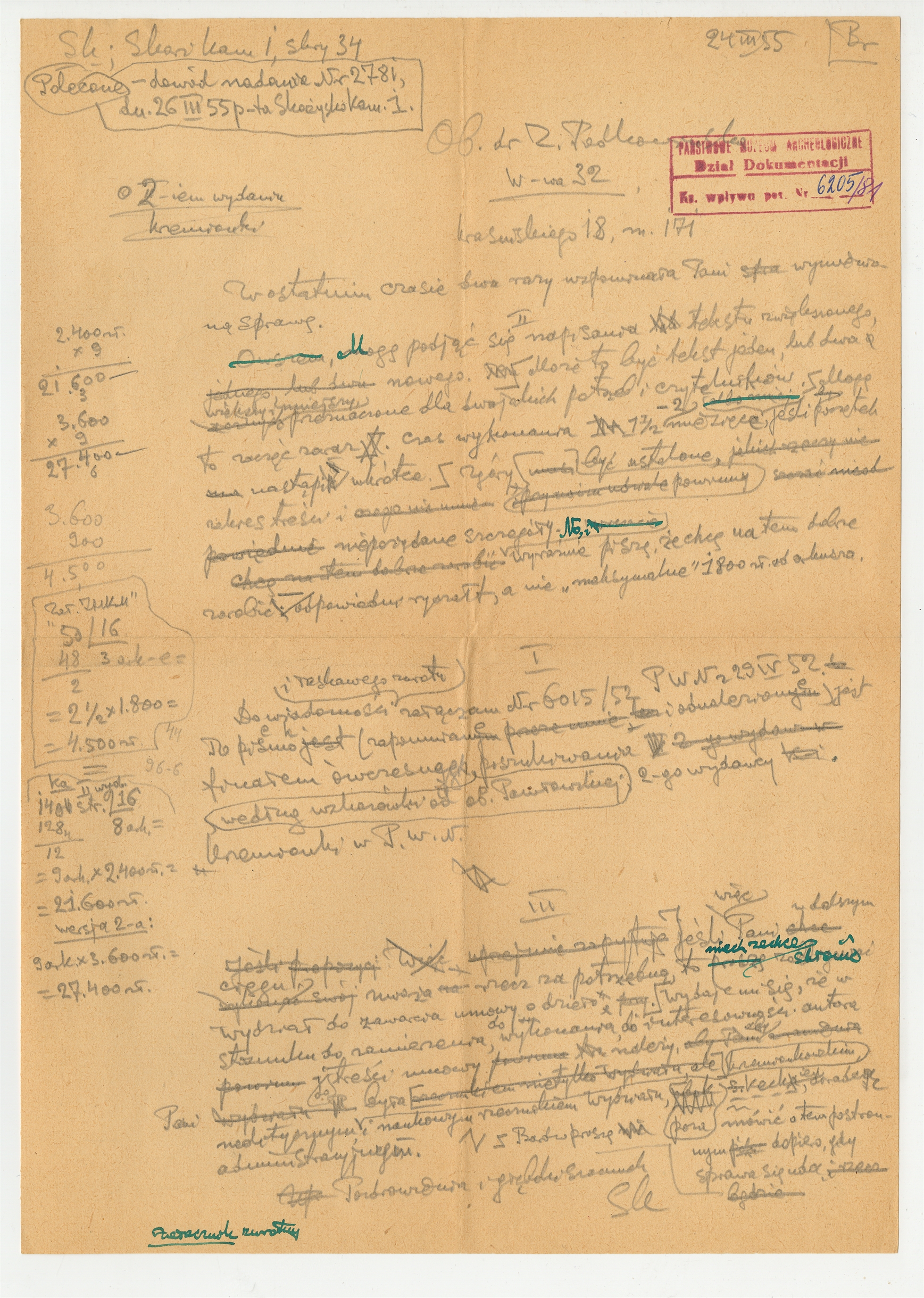 Rękopis - brudnopis listu Stefana Krukowskiego z dnia 24 III [19]55 roku do Z. Podkowińskiej