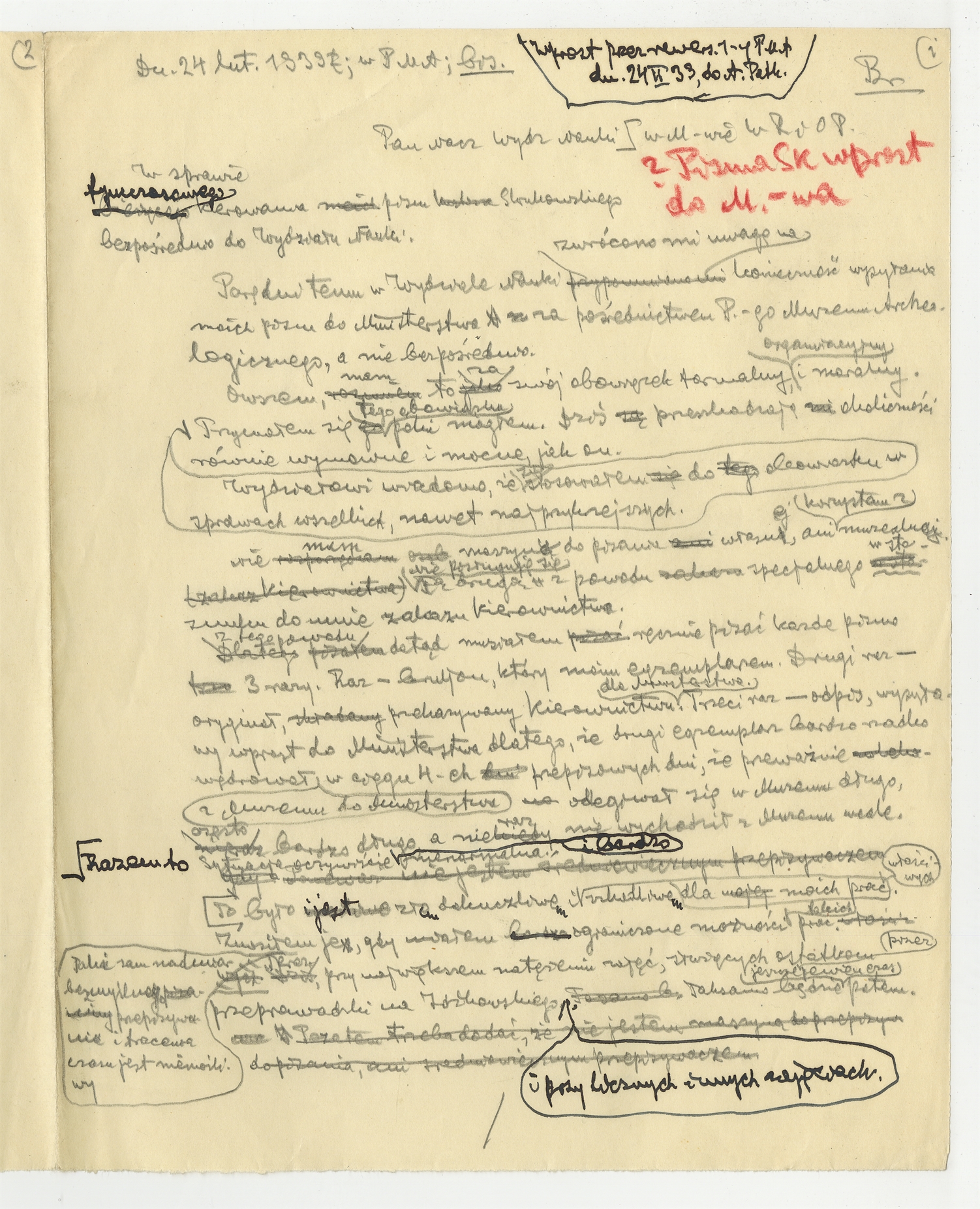 Rękopis - brudnopis listu Stefana Krukowskiego z dnia 24 lutego 1939 roku do Naczelnika Wydziału Nauki Ministerstwa W.R. i O.P. Strona 1