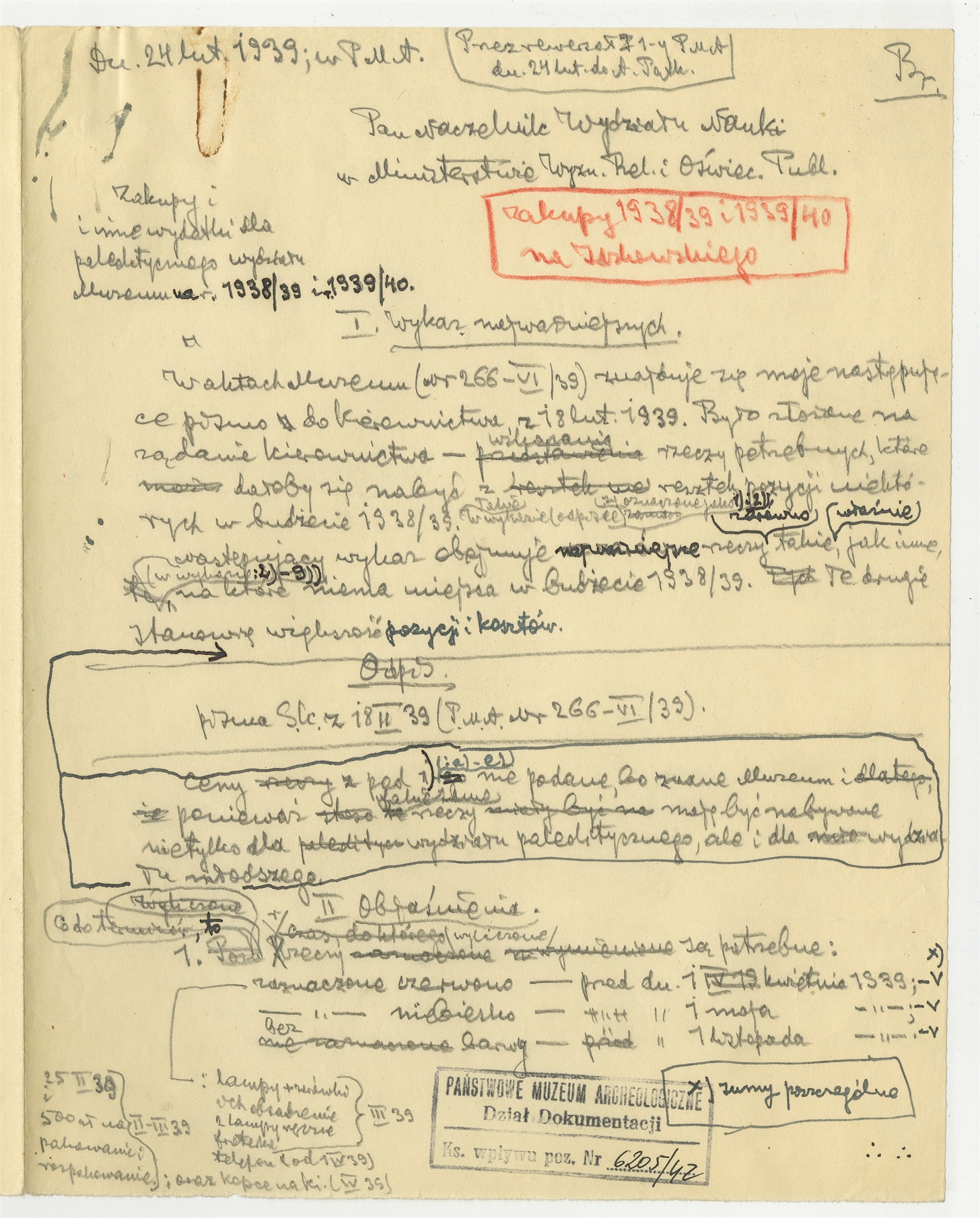 Rękopis - brudnopis listu Stefana Krukowskiego z dnia 24 lutego 1939 roku do Naczelnika Wydziału Nauki Ministerstwa W.R. i O.P. w sprawie zakupów dla wydziału paleolitycznego
