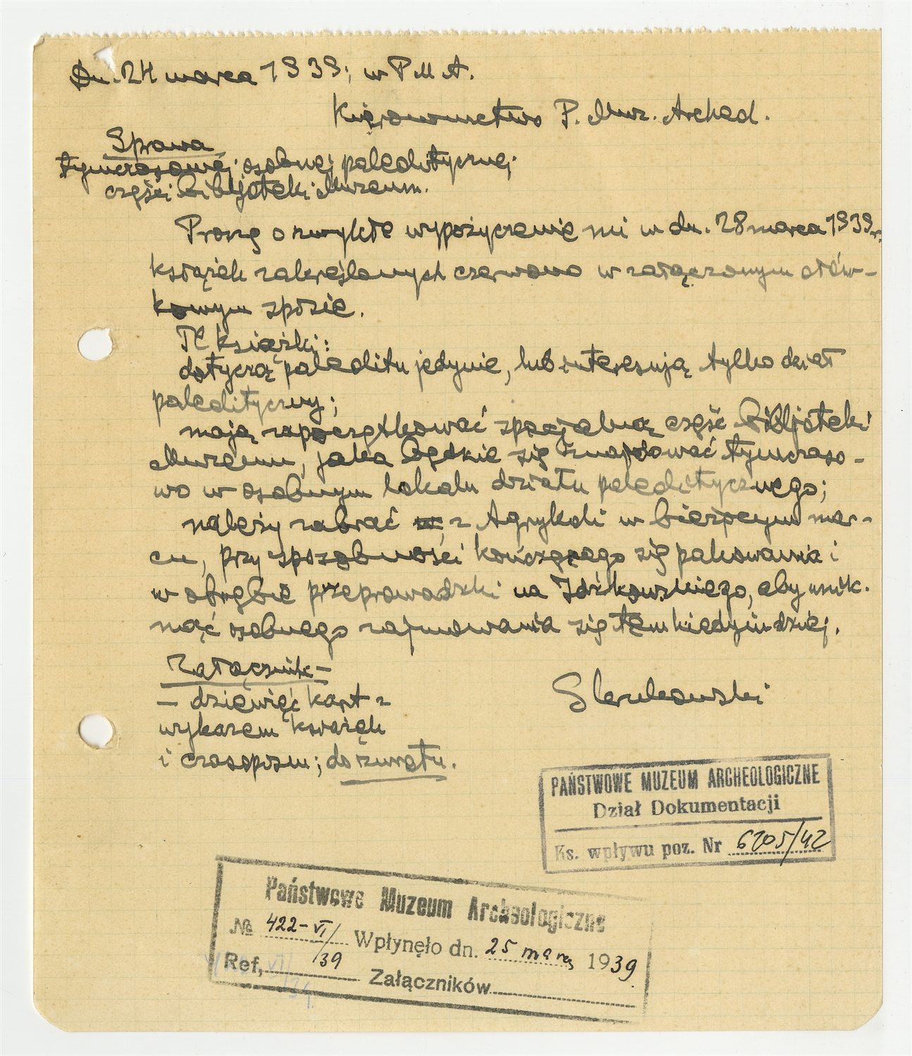 Rękopis - brudnopis listu Stefana Krukowskiego z dnia 24 marca 1939 roku do kierownictwa PMA w sprawie wypożyczenia książek