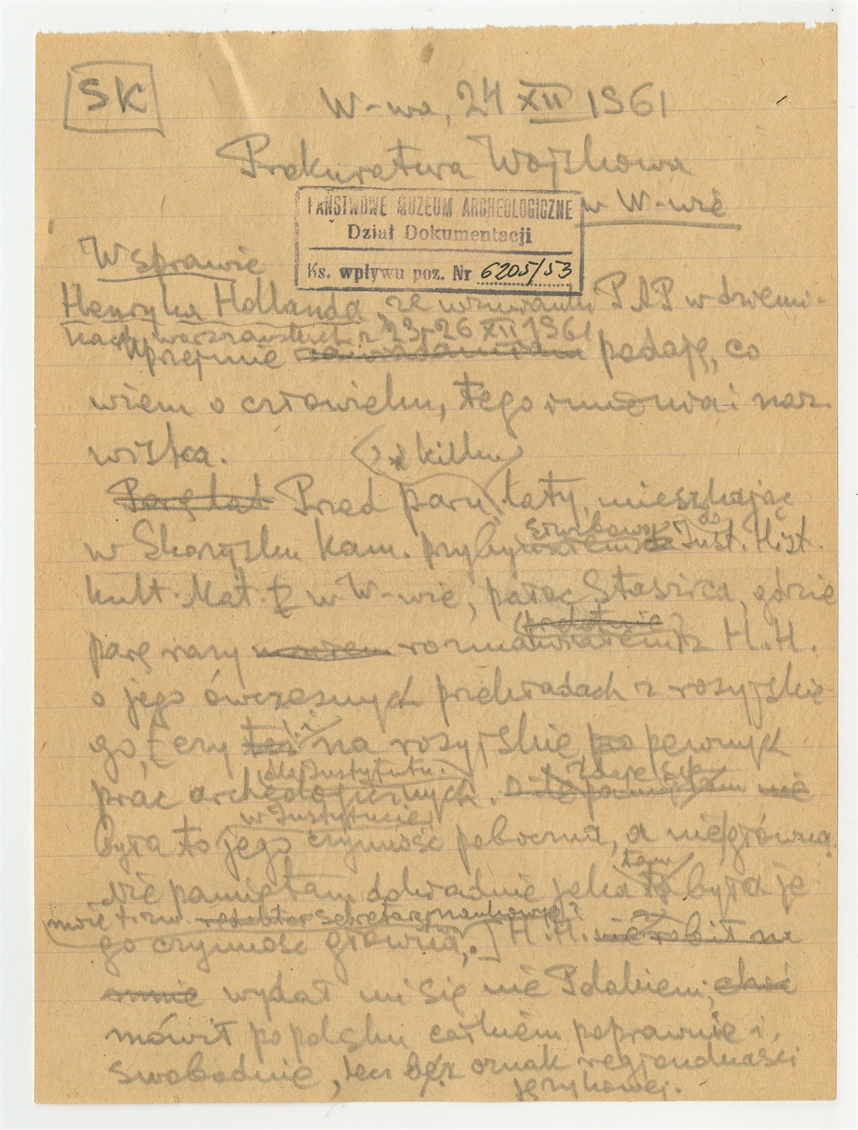 Rękopis - brudnopis listu Stefana Krukowskiego z dnia 24 XII 1961 roku do Prokuratury Wojskowej w Warszawie w sprawie Henryka Hollanda