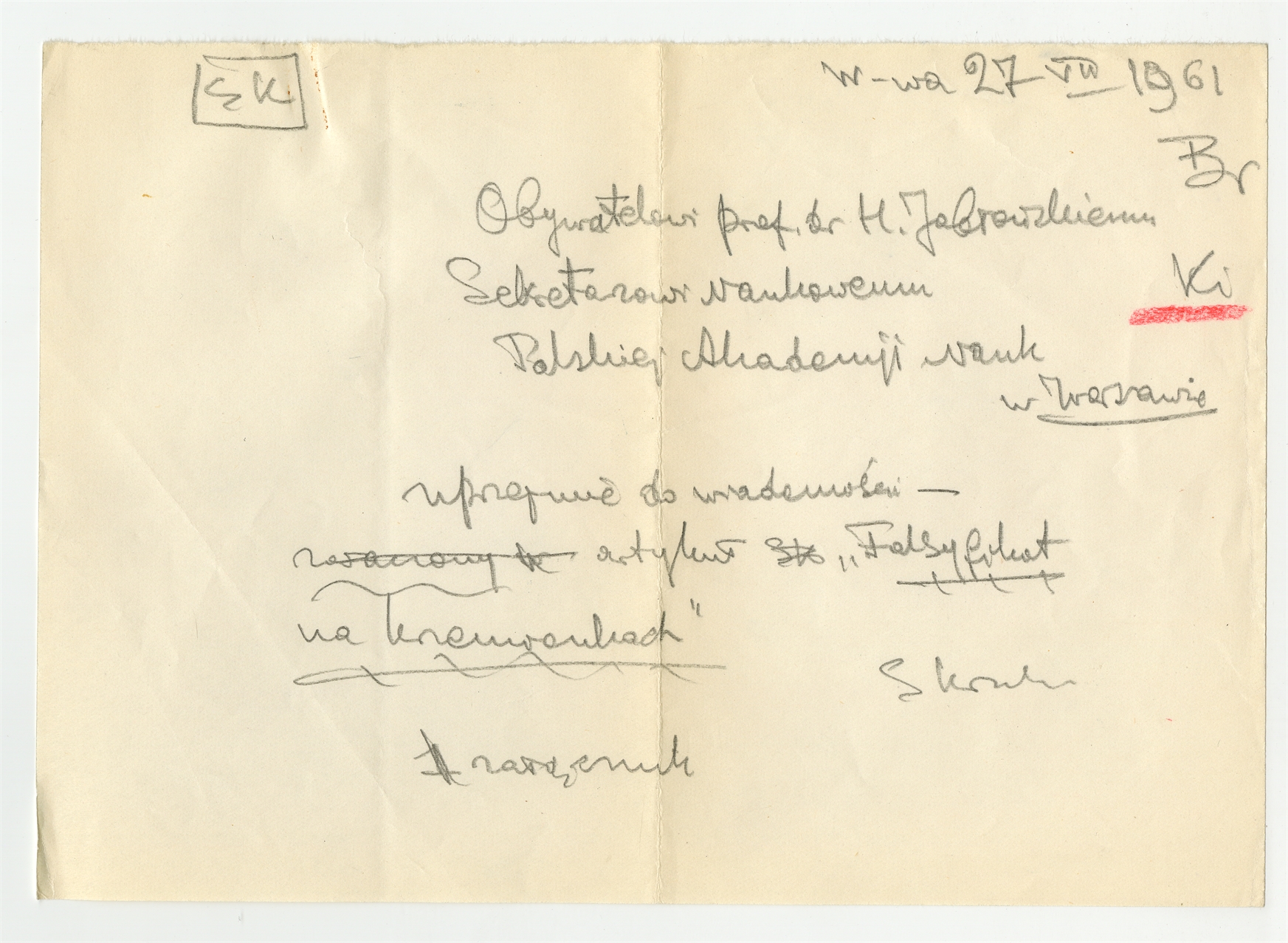 Rękopis - brudnopis listu Stefana Krukowskiego z dnia 27 VII 1961 roku do H. Jabłońskiego Sekretarza Naukowego PAN