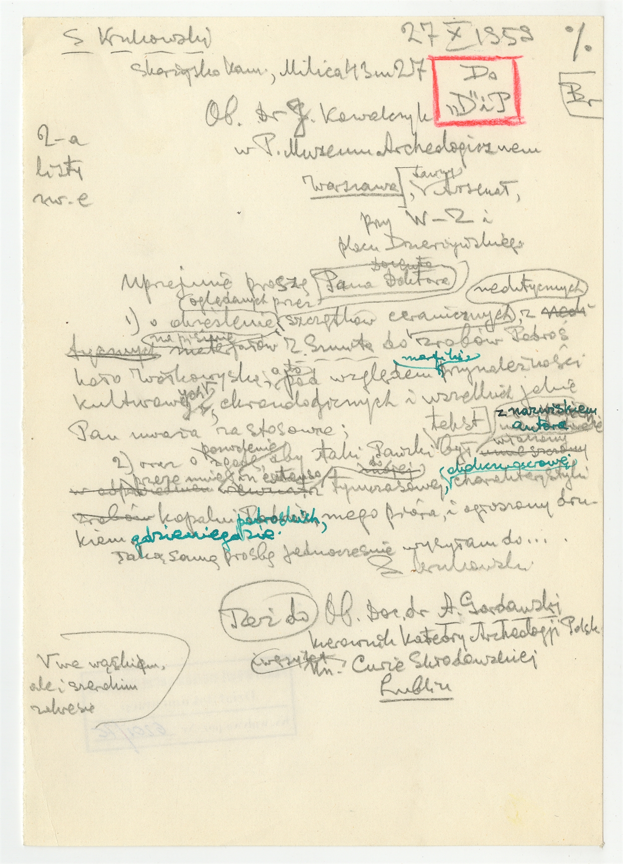 Rękopis - brudnopis listu Stefana Krukowskiego z dnia 27 X 1959 roku do Jana Kowalczyka