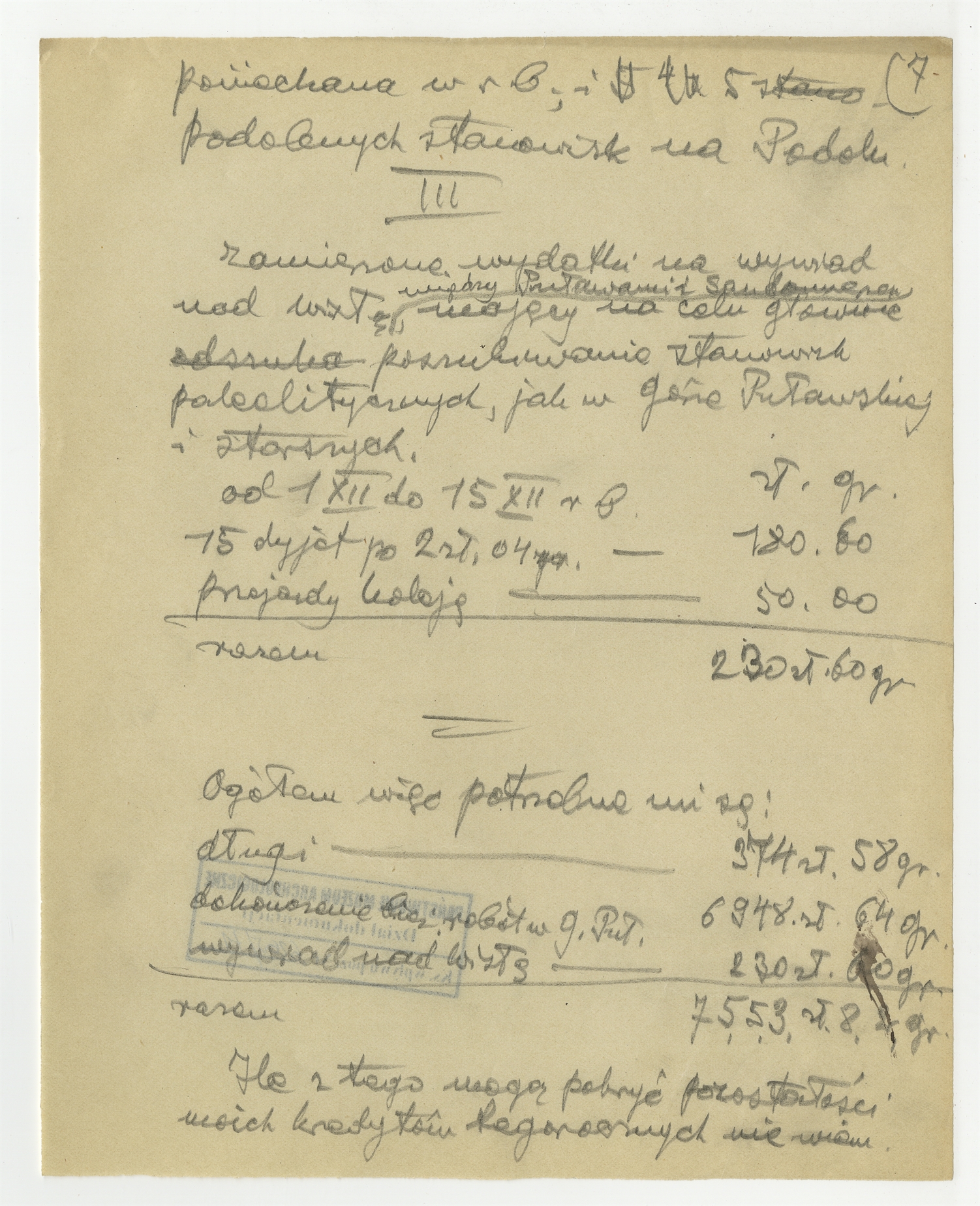 Rękopis - brudnopis listu Stefana Krukowskiego z dnia 29 października 1925 roku do kierownika PGKZP w sprawie potrzeb pieniężnych związanych z prowadzeniem badań wykopaliskowych w Górze Puławskiej. Strona 7