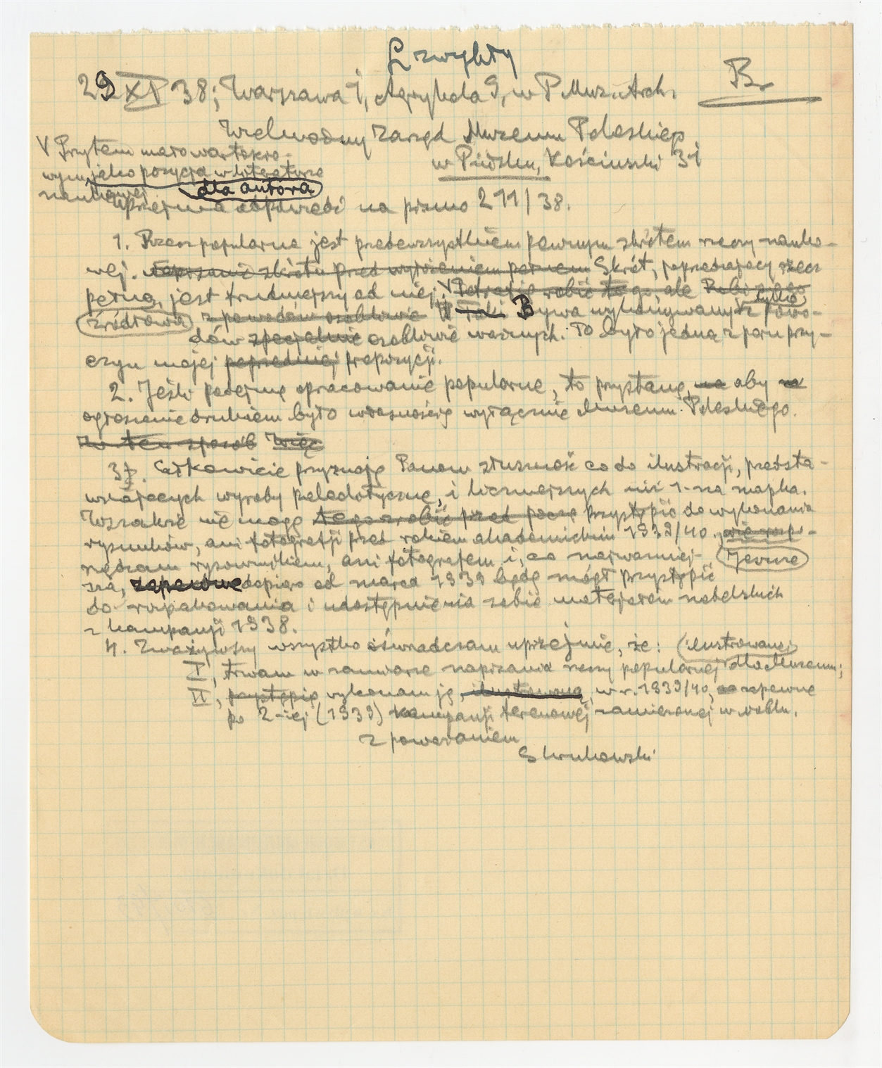 Rękopis - brudnopis listu Stefana Krukowskiego z dnia 29 XI [19]38 roku do Zarządu Muzeum Poleskiego w Pińsku