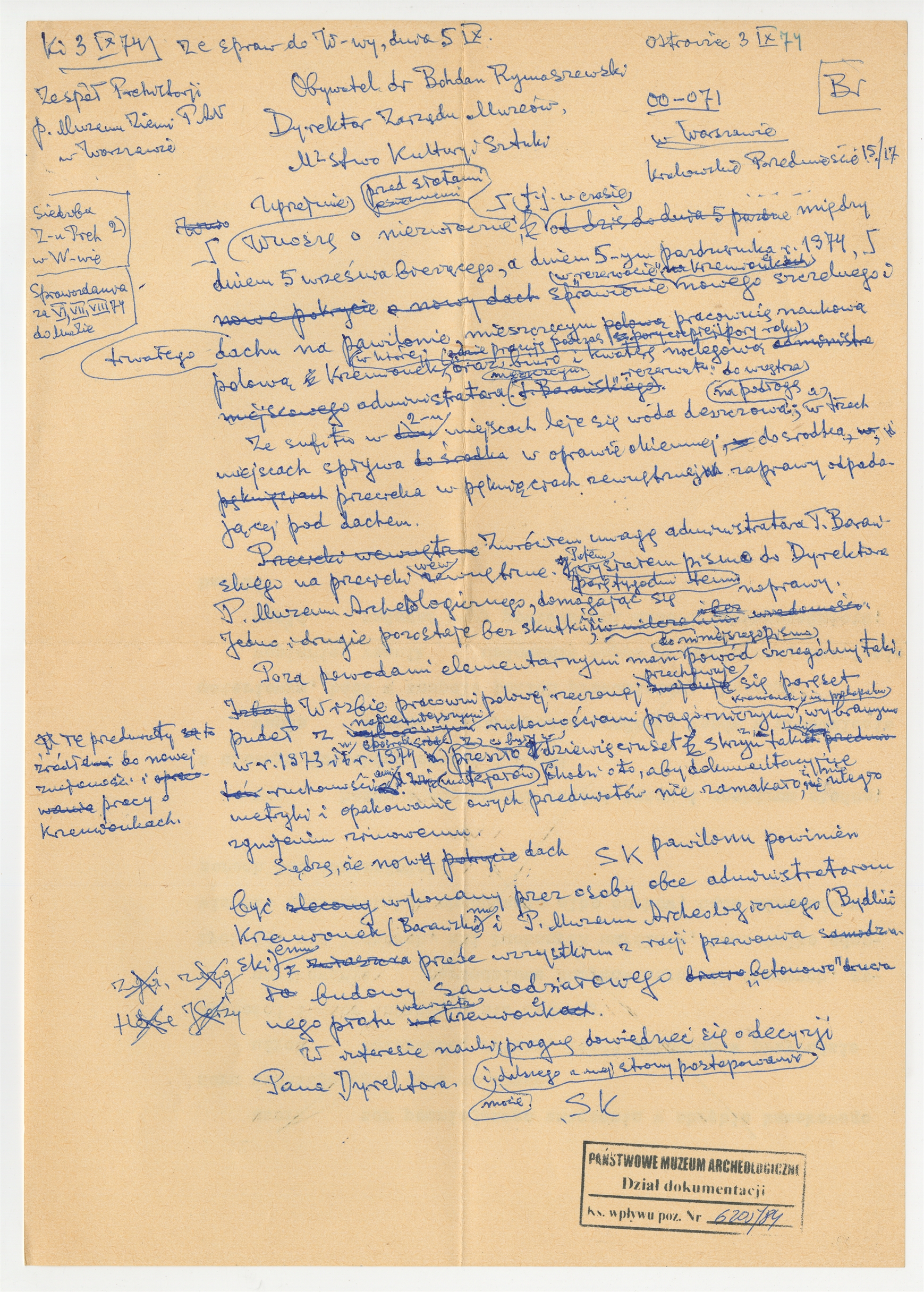 Rękopis - brudnopis listu Stefana Krukowskiego z dnia 3 IX [19]74 roku do B. Rymaszewskiego dyrektora Zarządu Muzeów