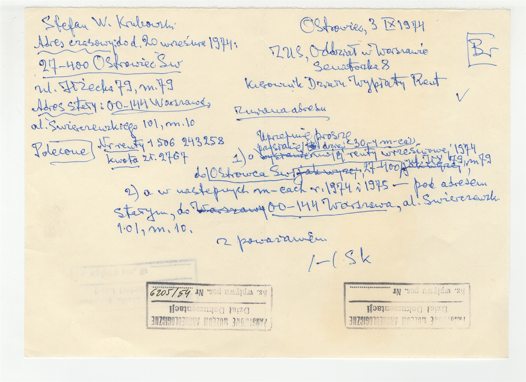 Rękopis - brudnopis listu Stefana Krukowskiego z dnia 3 IX 1974 roku do ZUS Oddział w Warszawie