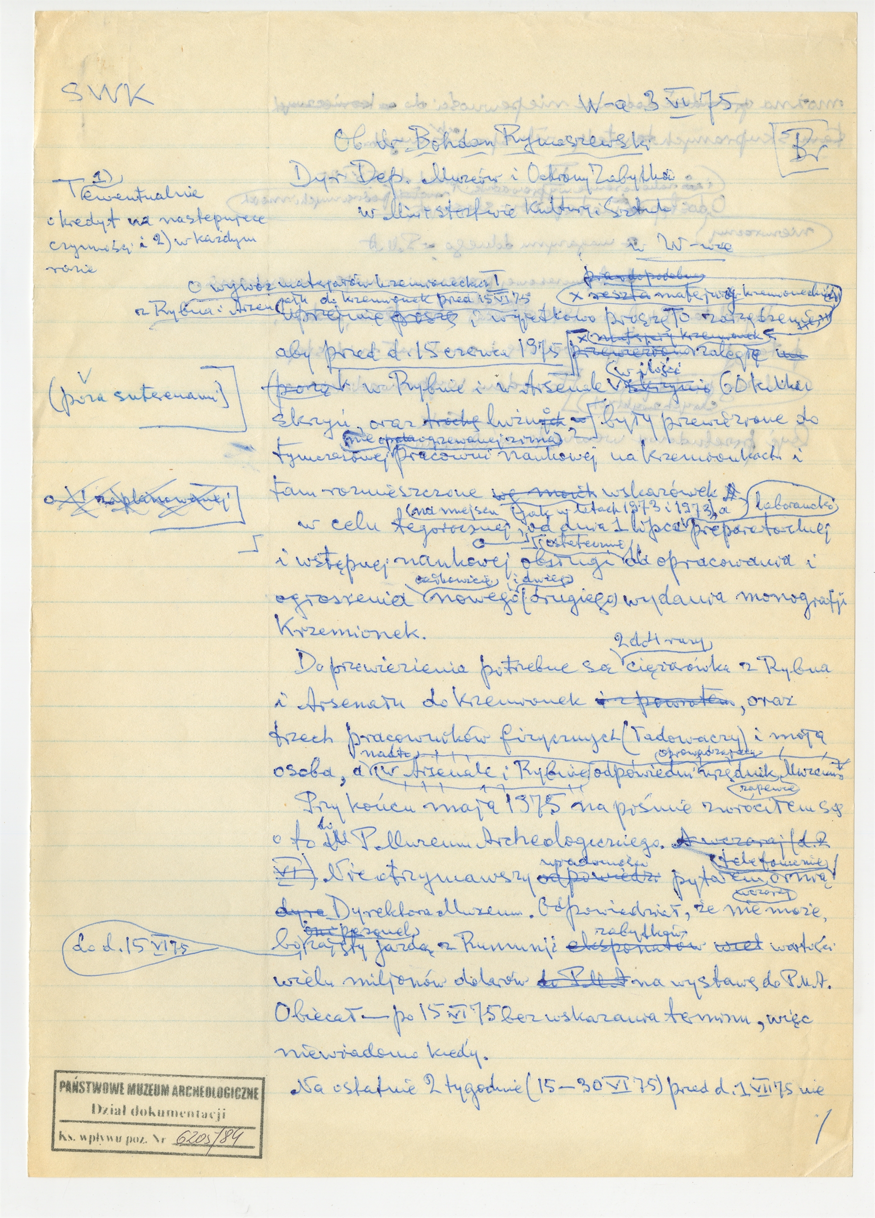 Rękopis - brudnopis listu Stefana Krukowskiego z dnia 3 VI [19]75 roku do B. Rymaszewskiego Dyrektora Departamentu Muzeów