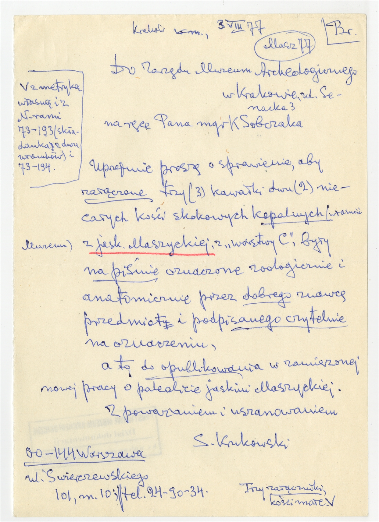 Rękopis - brudnopis listu Stefana Krukowskiego z dnia 3 VIII [19]77 roku do Zarządu Muzeum Archeologicznego w Krakowie