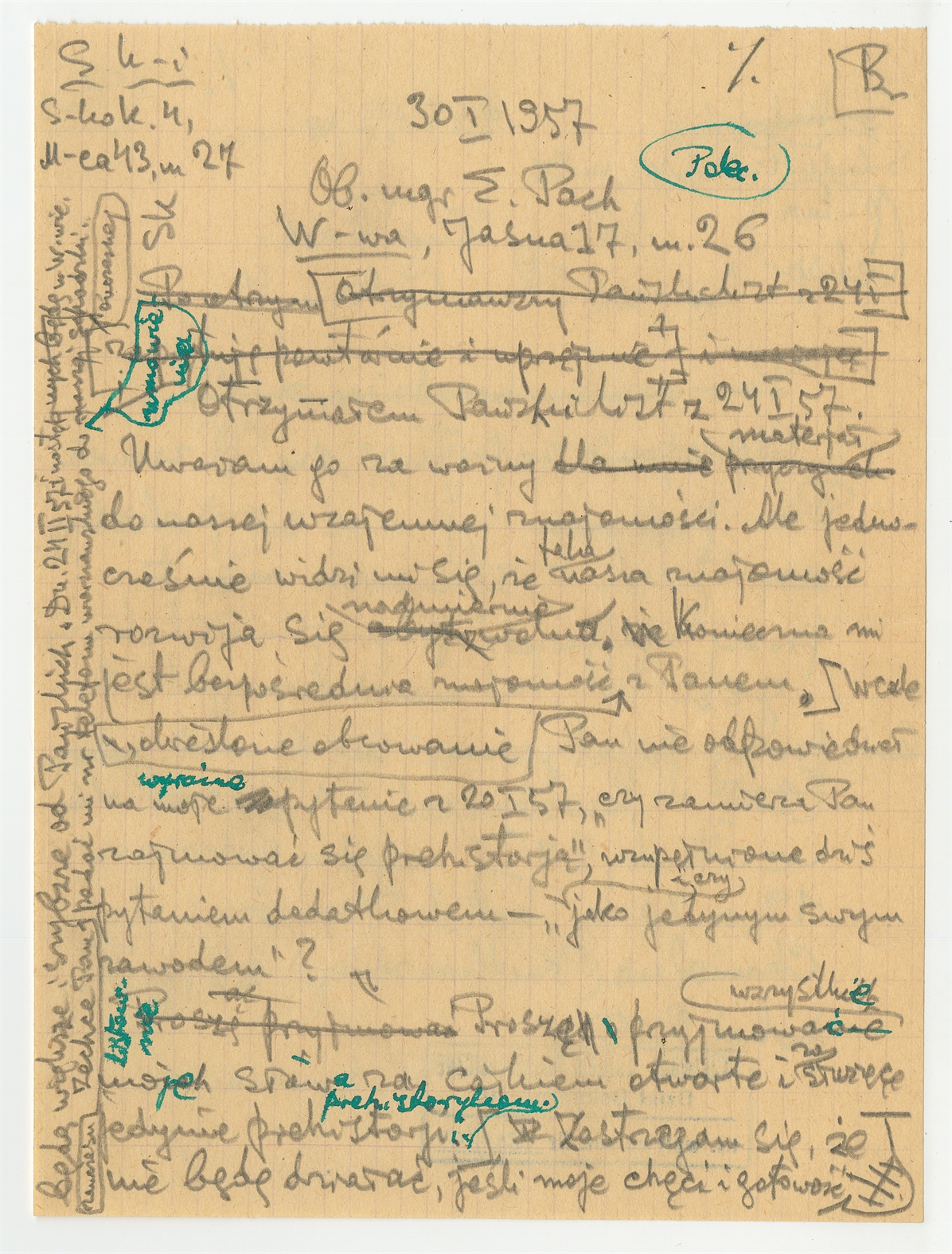 Rękopis - brudnopis listu Stefana Krukowskiego z dnia 30 I [19]57 roku do Eugeniusza Pacha