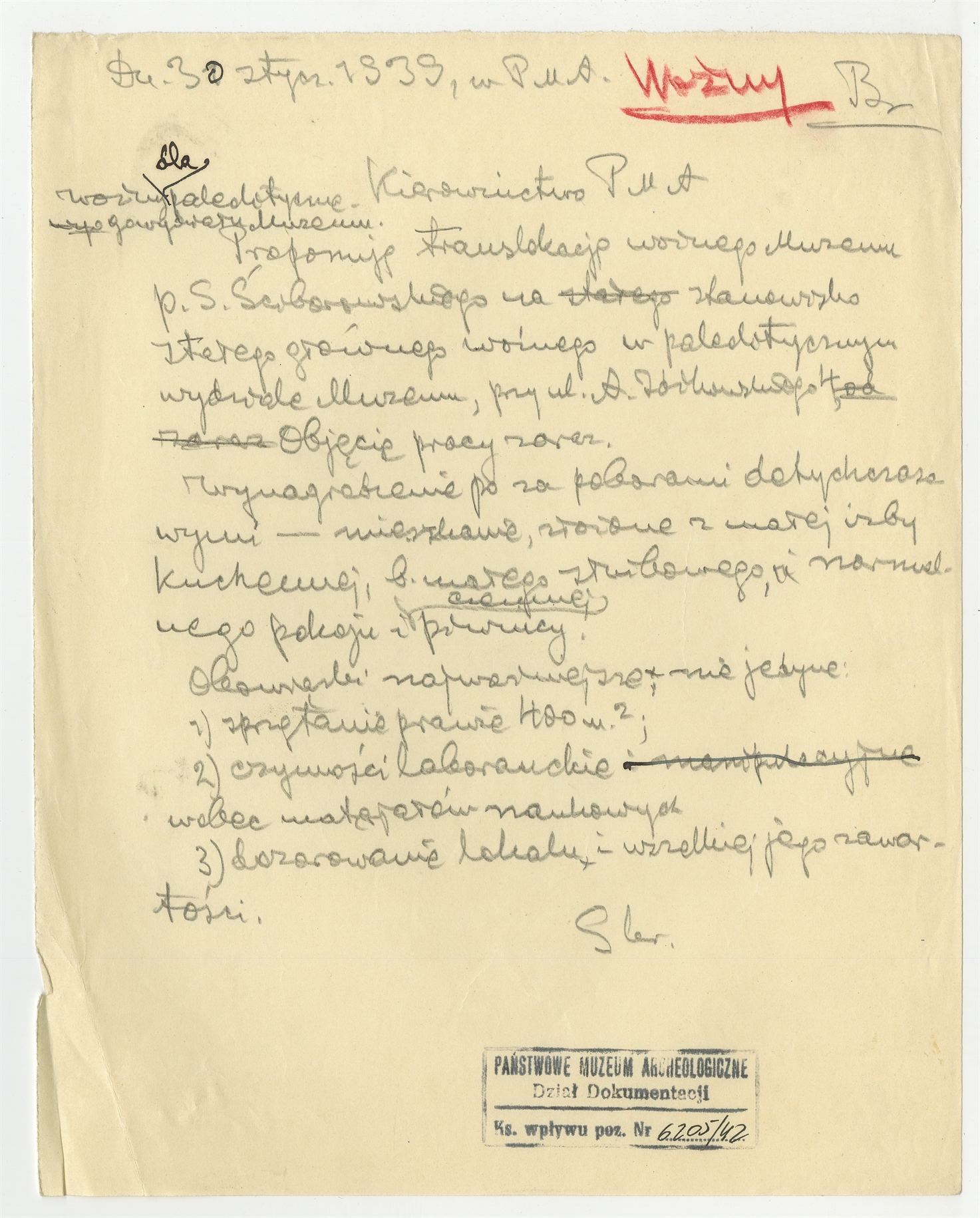 Rękopis - brudnopis listu Stefana Krukowskiego z dnia 30 stycznia 1939 roku do kierownictwa PMA w sprawie translokacji woźnego