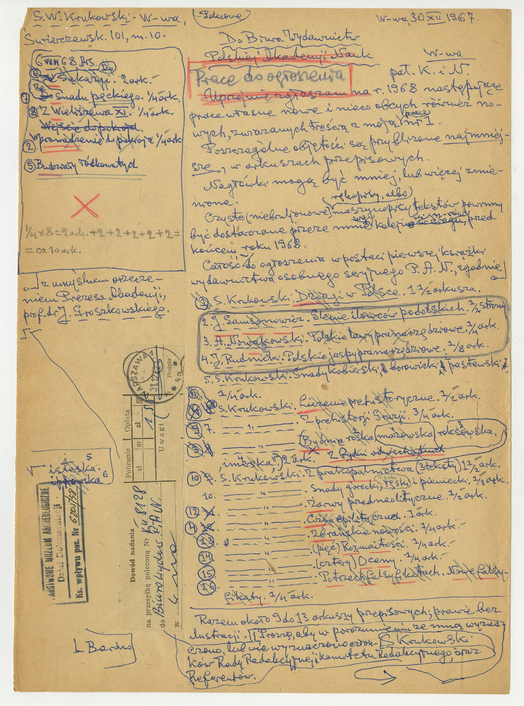 Rękopis - brudnopis listu Stefana Krukowskiego z dnia 30 XII 1967 roku do Biura Wydawnictw Polskiej Akademii Nauk wraz z naklejonym dowodem nadania na przesyłkę poleconą z dnia 31 XII [19]67 roku