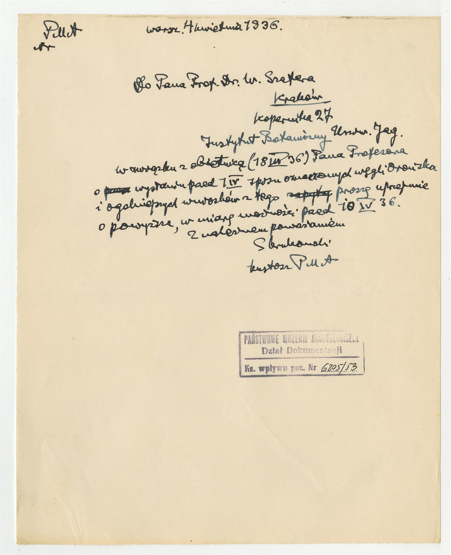 Rękopis - brudnopis listu Stefana Krukowskiego z dnia 4 kwietnia 1936 roku do Władysława Szafera