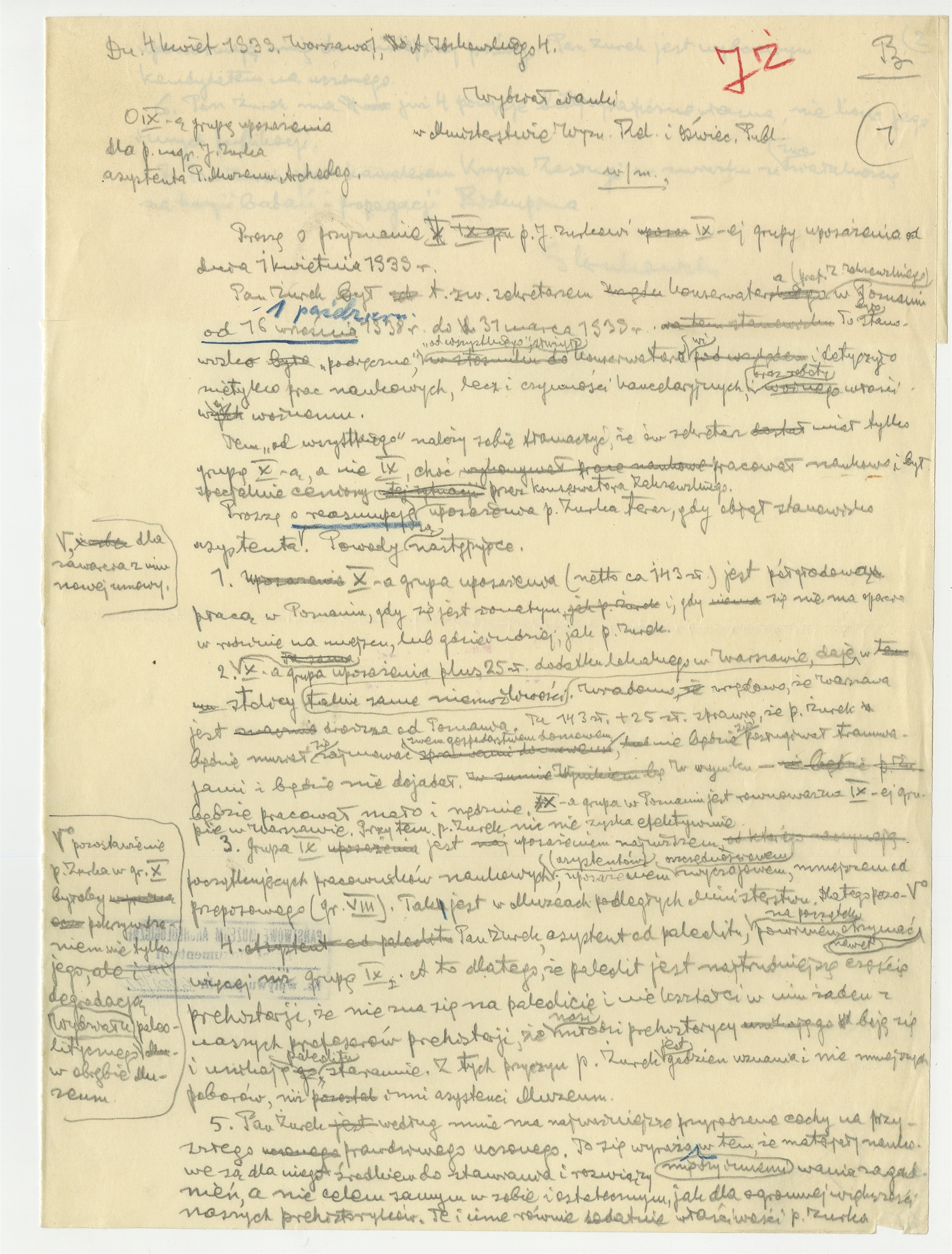 Rękopis - brudnopis listu Stefana Krukowskiego z dnia 4 kwietnia do Wydziału Nauki w Ministerstwie W.R i O.P. dotyczący wysokości pensji Jana Żurka. Strona 1