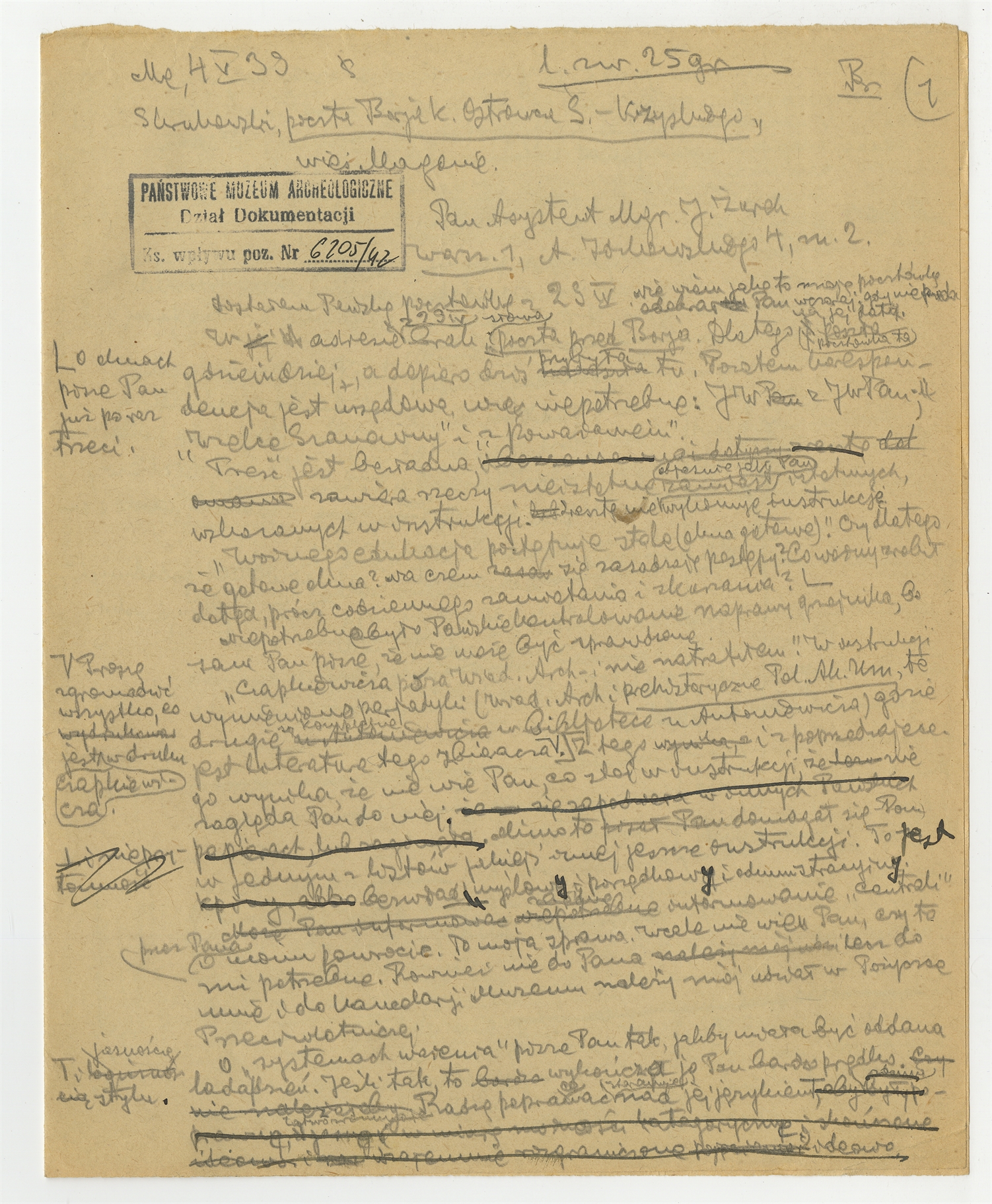 Rękopis - brudnopis listu Stefana Krukowskiego z dnia 4 V [19]39 roku do Jana Żurka. Strona 1