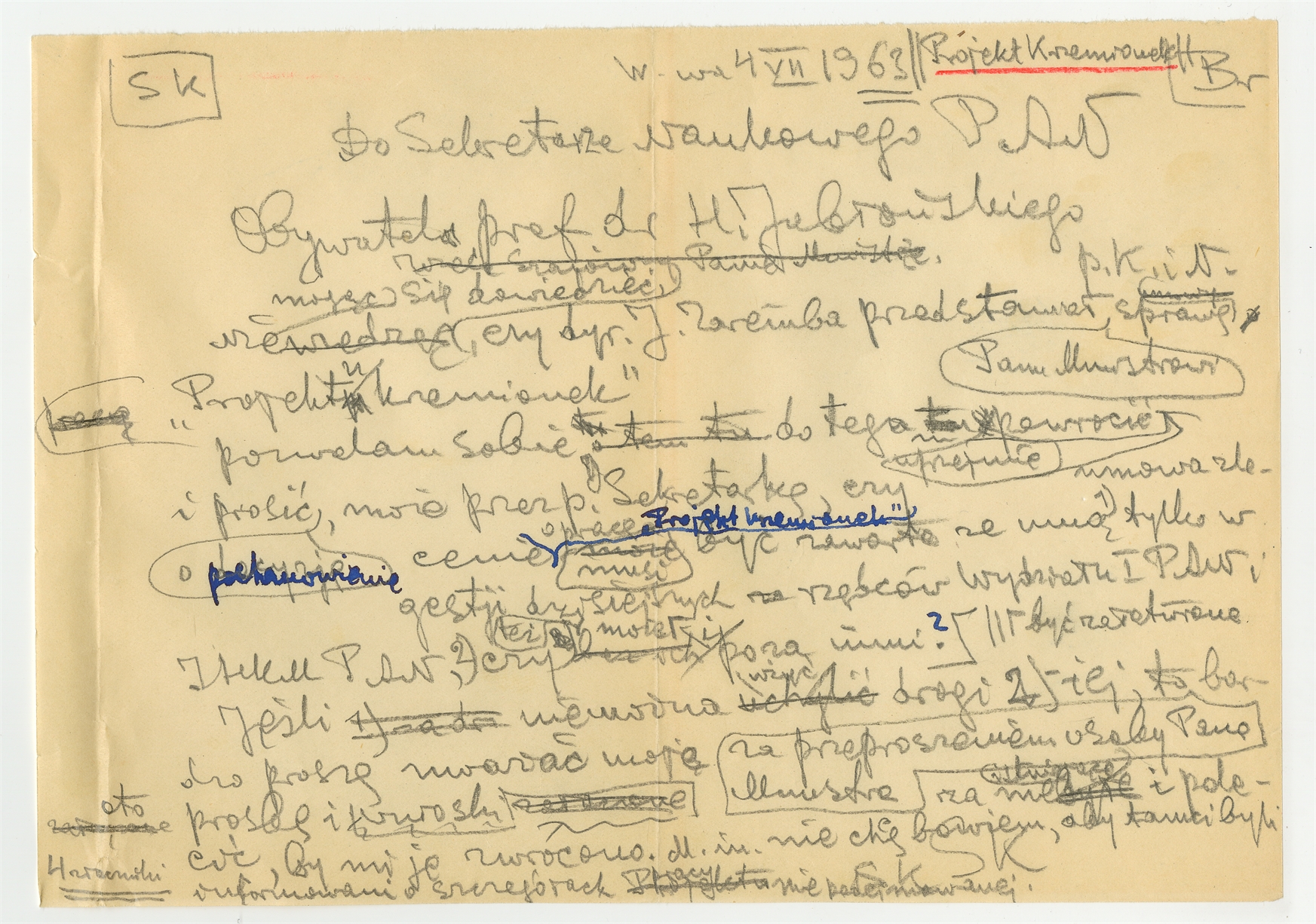 Rękopis - brudnopis listu Stefana Krukowskiego z dnia 4 VII 1963 roku do H. Jabłońskiego Sekretarza Naukowego PAN