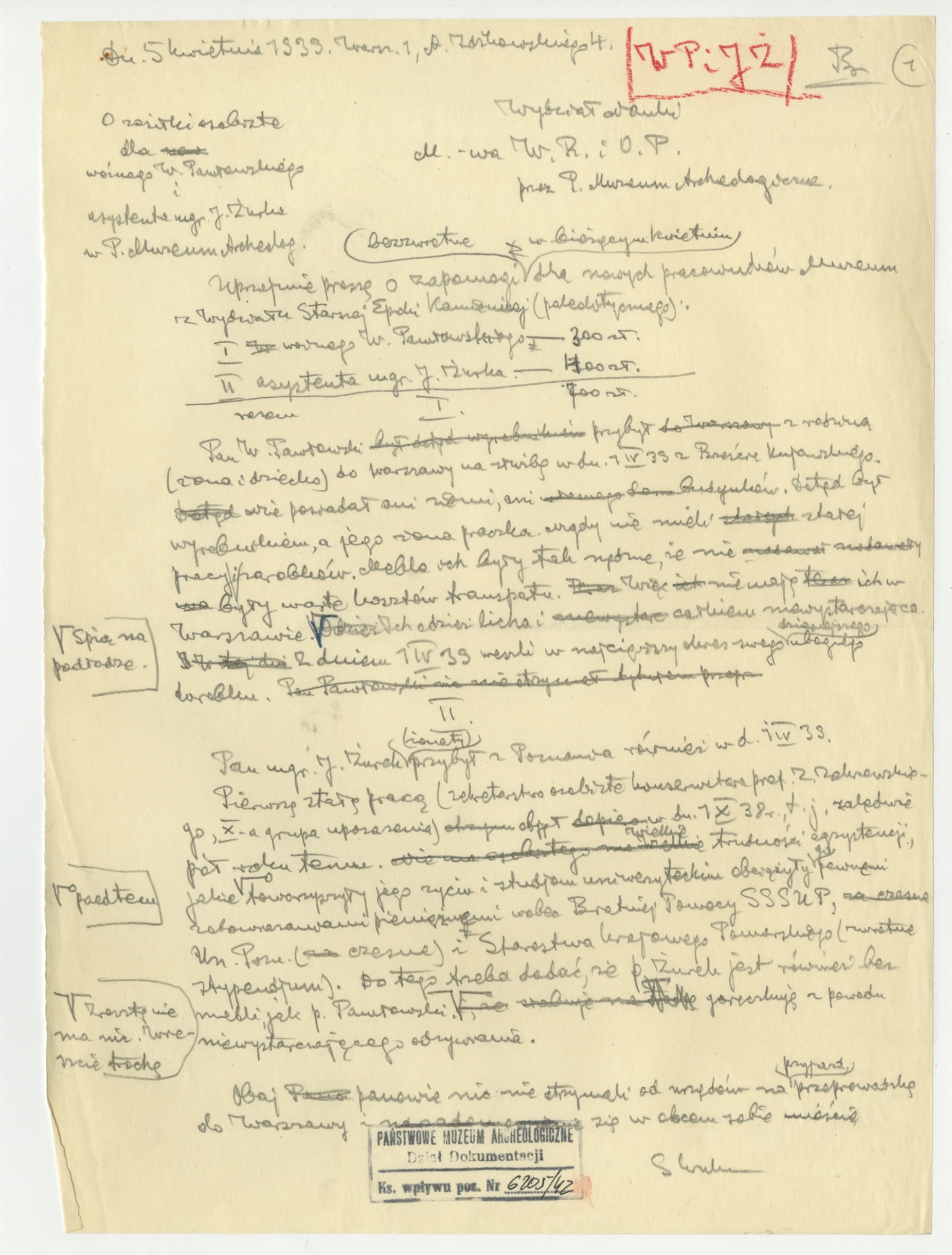 Rękopis - brudnopis listu Stefana Krukowskiego z dnia 5 kwietnia do Wydziału Nauki w Ministerstwie W.R i O.P. w sprawie zasiłków osobistych dla pracowników