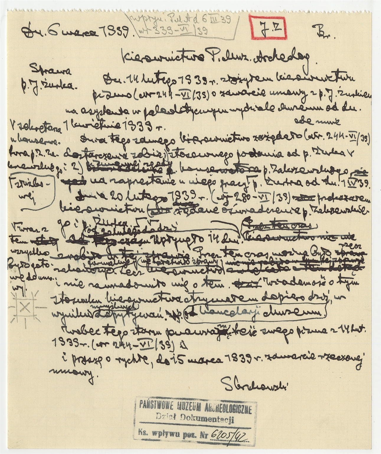 Rękopis - brudnopis listu Stefana Krukowskiego z dnia 6 marca 1939 roku do kierownictwa PMA w sprawie Jana Żurka