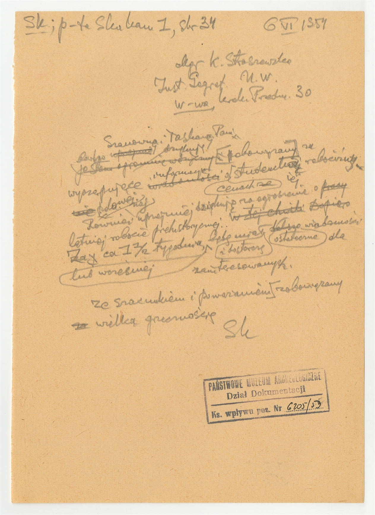 Rękopis - brudnopis listu Stefana Krukowskiego z dnia 6 VI 1954 roku do K. Straszewskiej