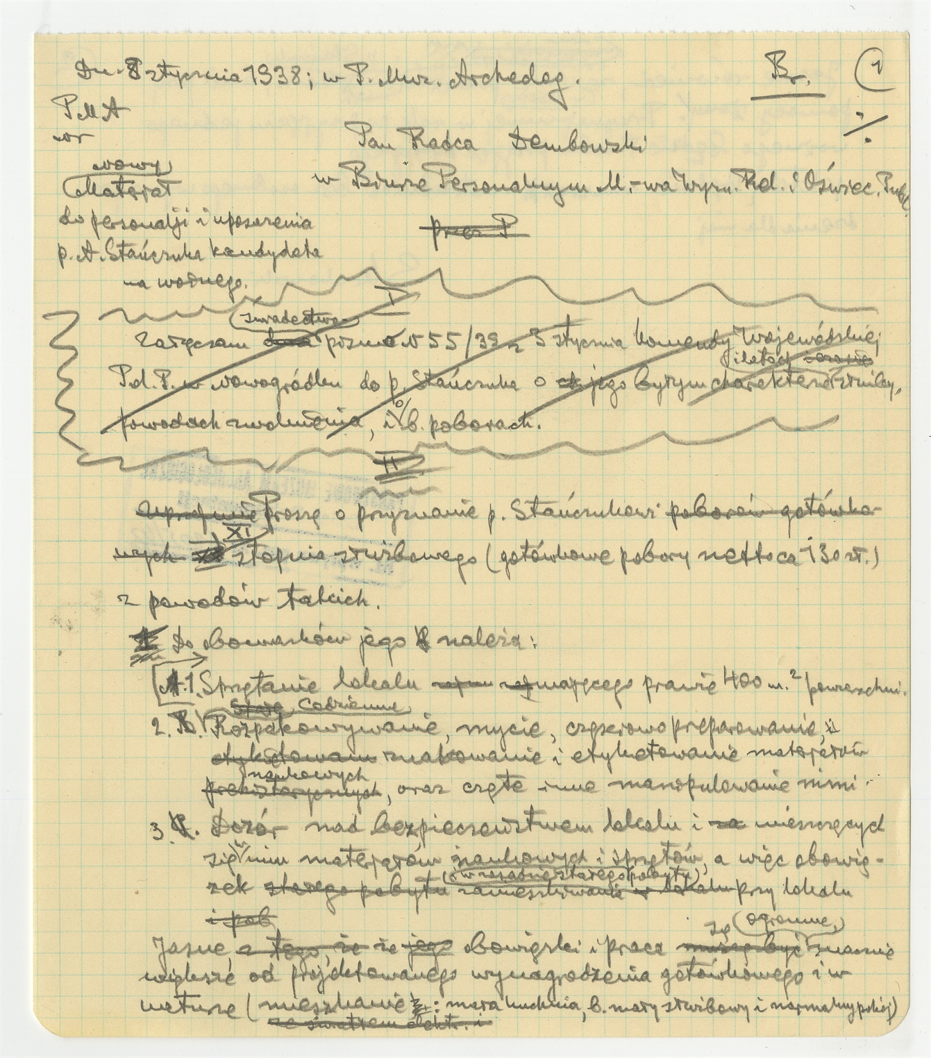 Element 1 - Rękopis - brudnopis listu Stefana Krukowskiego z dnia 8 stycznia 1938 roku do J. Dembowskiego w sprawie uposażenia A. Stańczuka. Strona 1