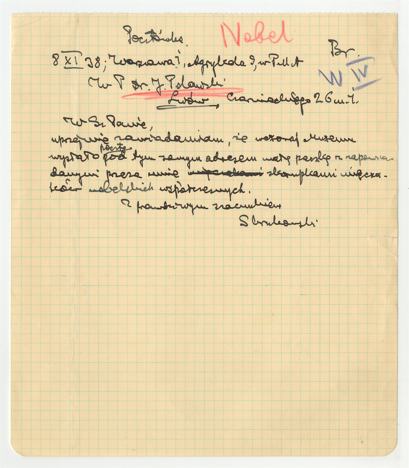 Rękopis - brudnopis listu Stefana Krukowskiego z dnia 8 XI [19]38 roku do Jerzego Polańskiego