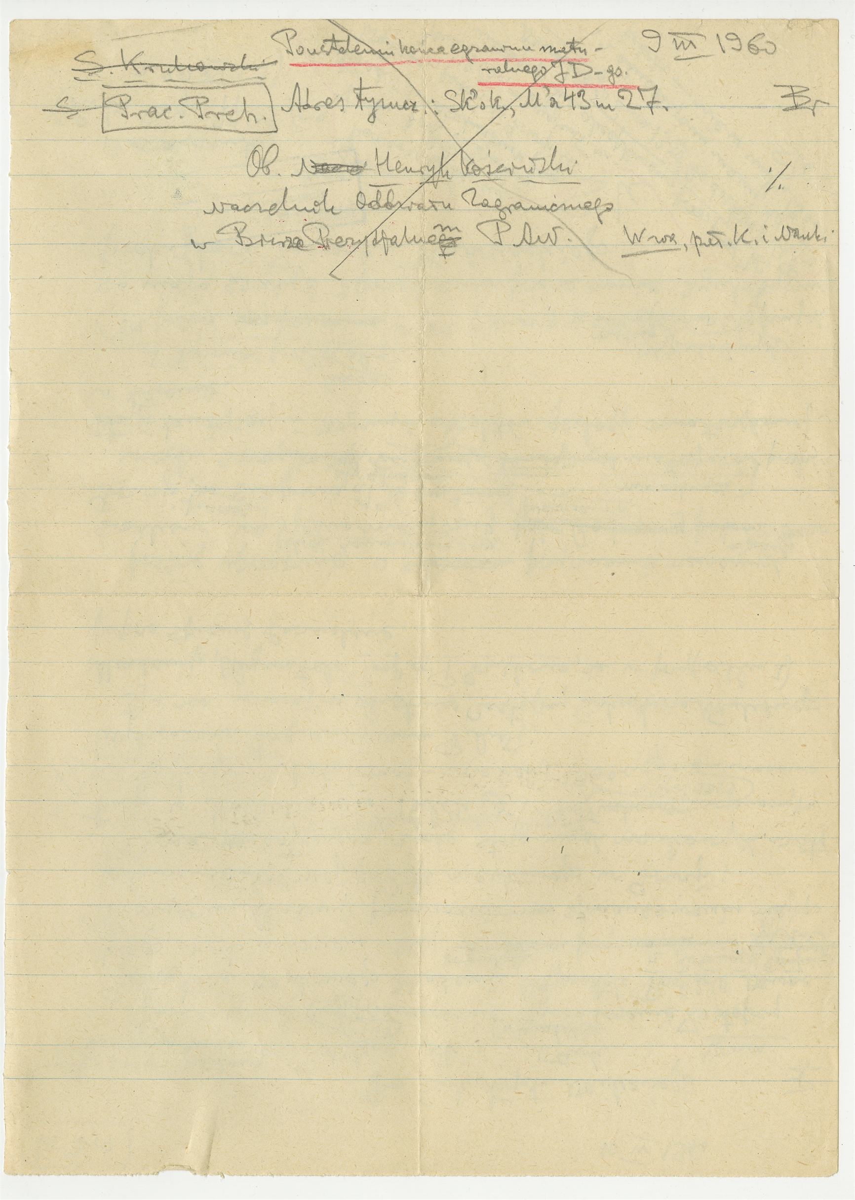 Rękopis - brudnopis listu Stefana Krukowskiego z dnia 9 III 1960 roku do Henryka Kościńskiego z PAN (fragment - początek)