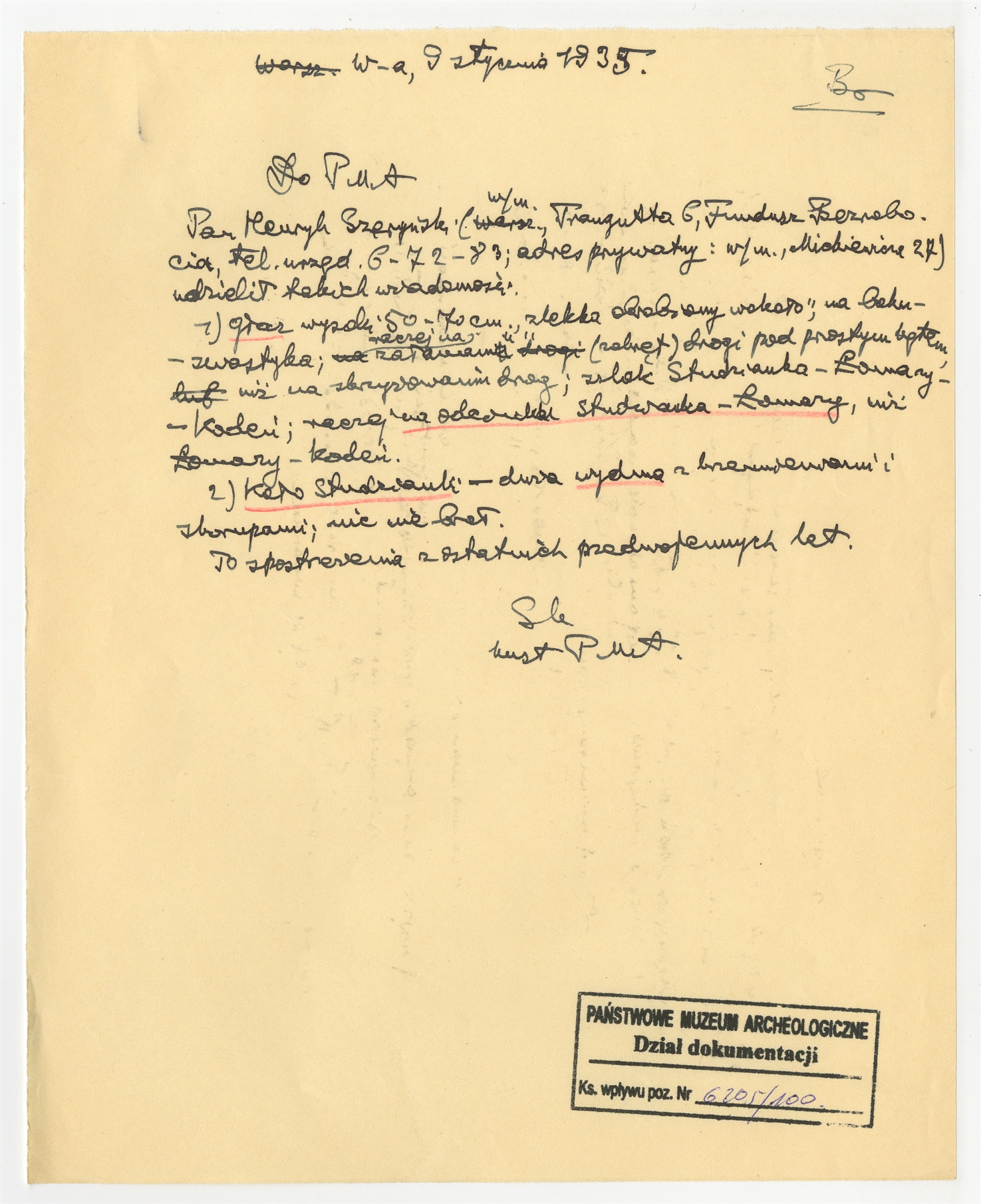 Rękopis - brudnopis listu Stefana Krukowskiego z dnia 9 stycznia 1935 roku do PMA