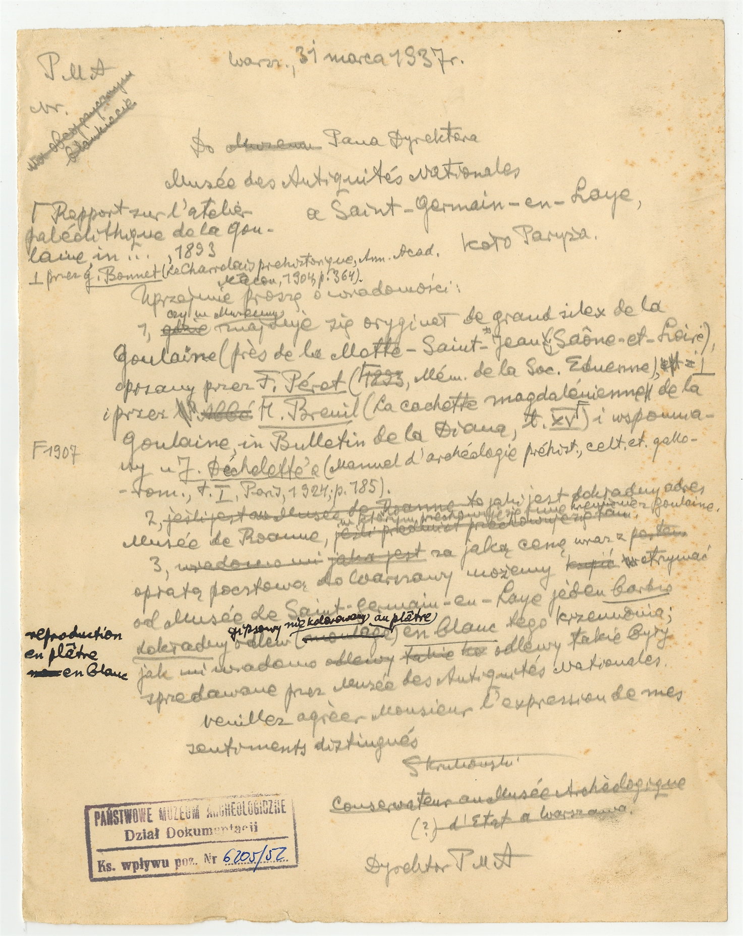 Rękopis - brudnopis listu Stefana Krukowskiego z dnia31 marca 1937 roku do Dyrektora Musee des Antiquites Nationale