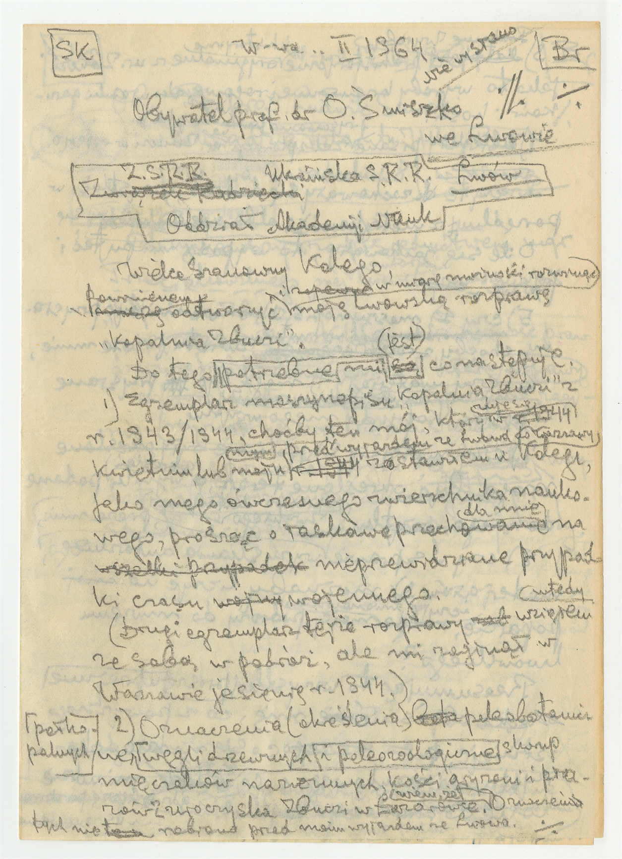 Rękopis - brudnopis listu Stefana Krukowskiego z II 1964 roku do O.Śmiszko