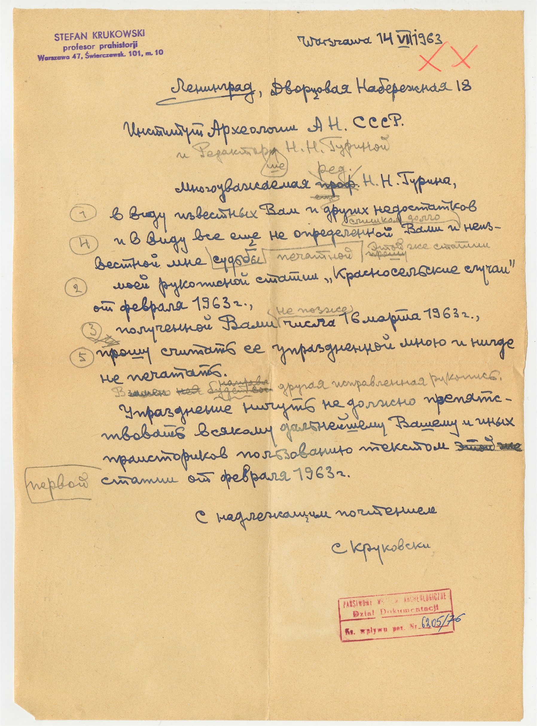 Rękopis - brudnopis listu w j. rosyjskim Stefana Krukowskiego z dnia 14 VII 1963 roku do Niny Guriny