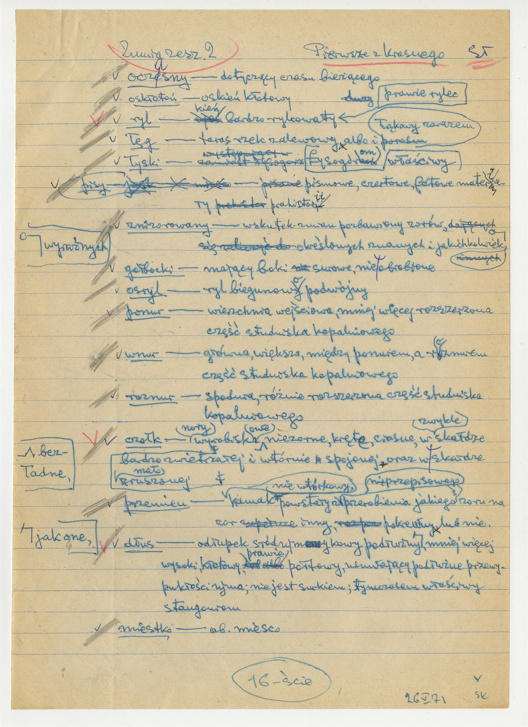 Rękopis - brudnopis notatki do słownika ("do Zumi zesz. 2") - strona 7: zatytułowana "Pierwsze z Krasnego 26 V [19]71 (bez numeru autorskiej strony)