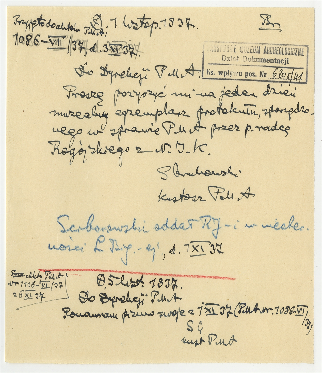 Rękopis-brudnopis pism prof. Stefana Krukowskiego z dn. 1 i 5 listopada 1937 r. skierowanych do Dyrekcji PMA. Pisma w sprawie pożyczenia egzemplarza protokołu sporządzonego przez p. radcę Rogójskiego