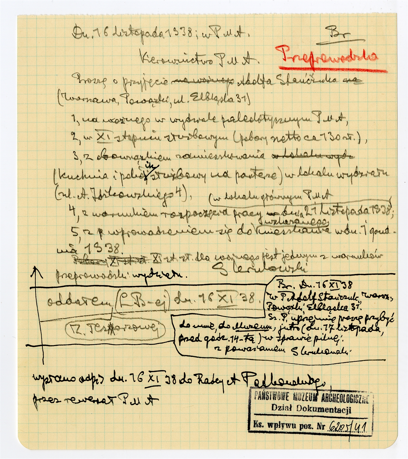 Rękopis-brudnopis pism Stefana Krukowskiego z 16 XI 1938 r. skierowanych do "Kierownictwa PMA" oraz do Adolfa Stańczuka w sprawie przyjęcia woźnego: "Proszę o przyjęcie Adolfa Stańczuka […]"
