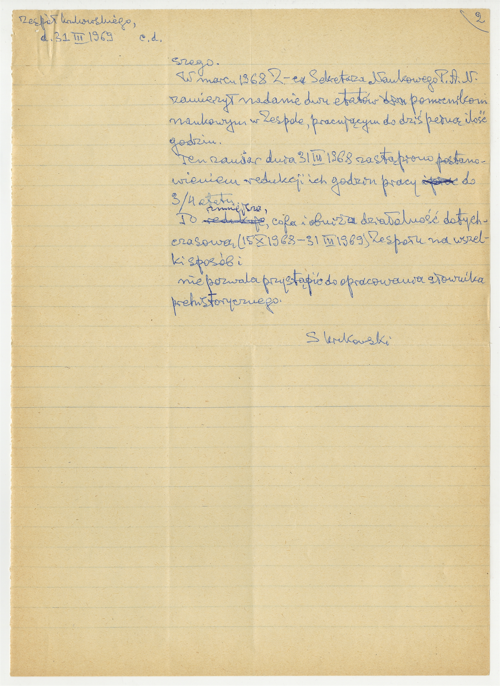 Rękopis - brudnopis pisma Kierownika Zespołu Krukowskiego do Dyrektora Generalnego oraz Dyrektora B. Finansowego P.A.N. w sprawie prośby o przyznanie w r. 1969 Zespołowi trzeciego starszego asystenta - cd. - strona 2: "W marcu 1968" … "opracowania słownika prehistorycznego" (autorska strona 2)