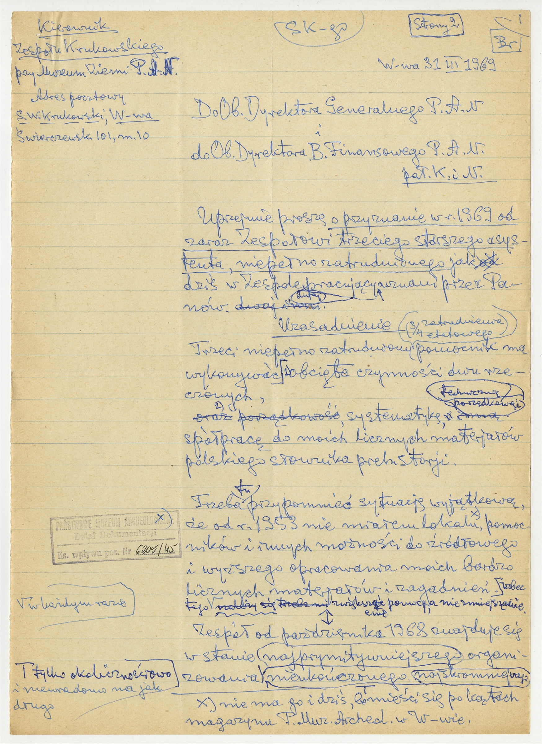 Rękopis - brudnopis pisma Kierownika Zespołu Krukowskiego do Dyrektora Generalnego oraz Dyrektora B. Finansowego P.A.N. w sprawie prośby o przyznanie w r. 1969 Zespołowi trzeciego starszego asystenta - strona 1: zatytułowana "Do Ob. Dyrektora Generalnego P.A.N. i do Ob. Dyrektora B. Finansowego P.A.N." W-wa 31 III 1969 (autorska strona 1)