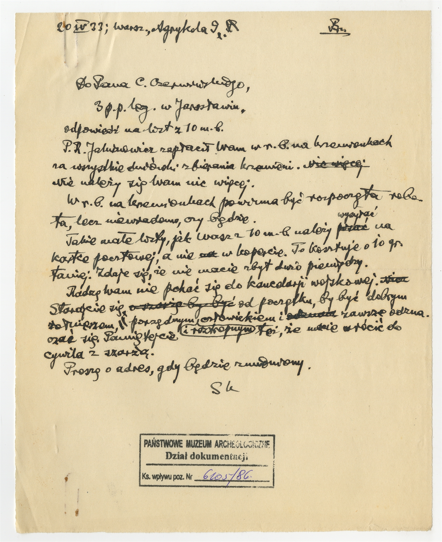 Rękopis-brudnopis pisma prof. Stefana Krukowskiego do C. Czerwińskiego z dnia 20 IV [19]33 r. - "P. R. Jakimowicz zapłacił Wam …"