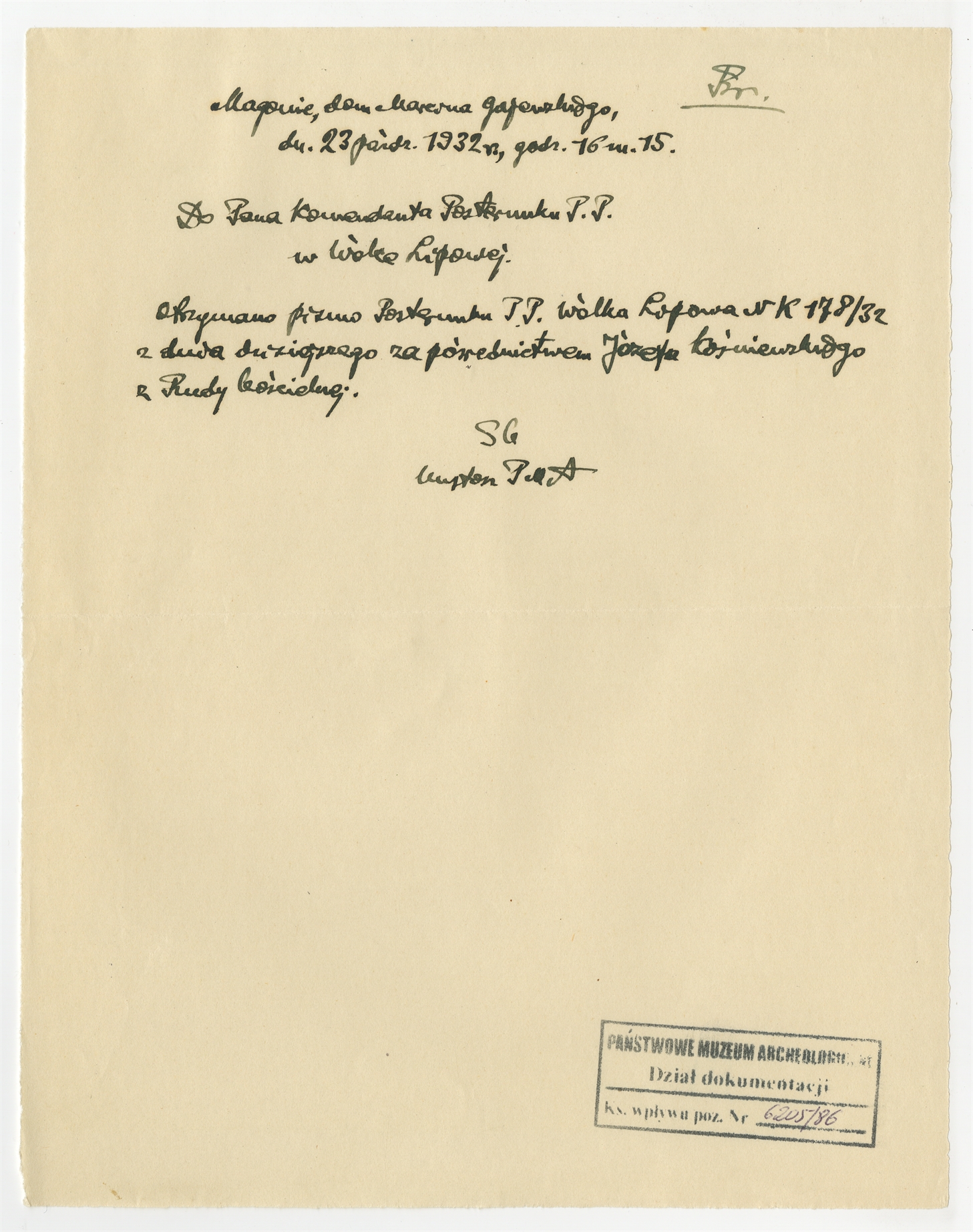 Rękopis-brudnopis pisma prof. Stefana Krukowskiego do Komendanta Posterunku P.P. w Wólce Lipowej z dnia 23 X 1932 r.
