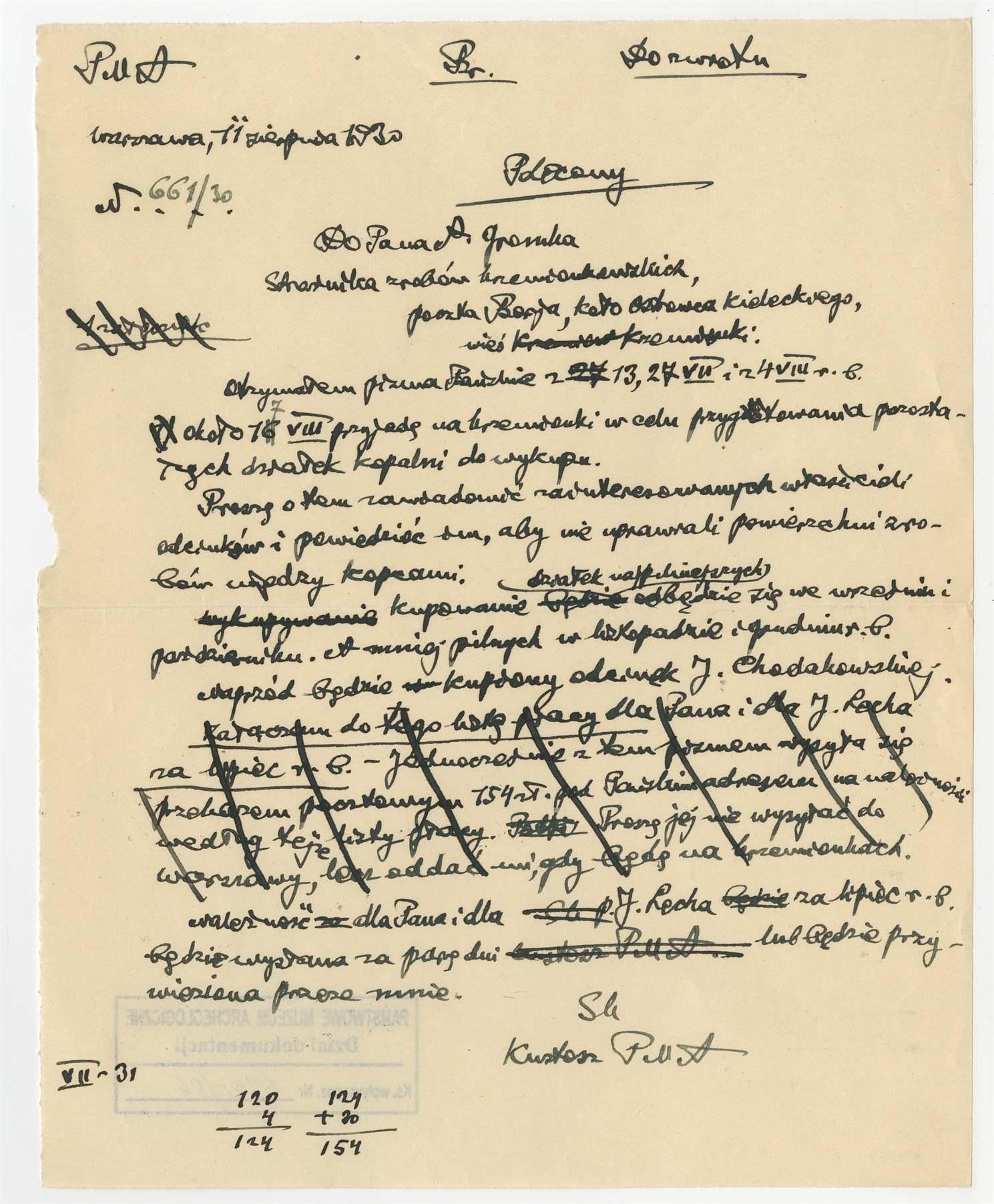 Rękopis-brudnopis pisma prof. Stefana Krukowskiego "Do Pana A. Gromka strażnika zrobów krzemionkowskich ..." z dnia 11 sierpnia 1930 r.