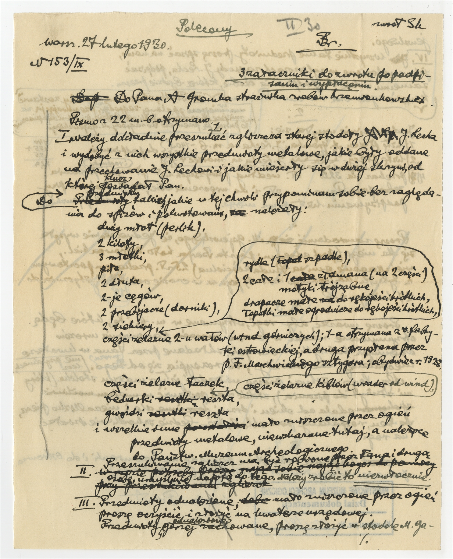 Rękopis-brudnopis pisma prof. Stefana Krukowskiego "Do Pana A. Gromka strażnika zrobów krzemionkowskich" z dnia 27 lutego 1930 r.