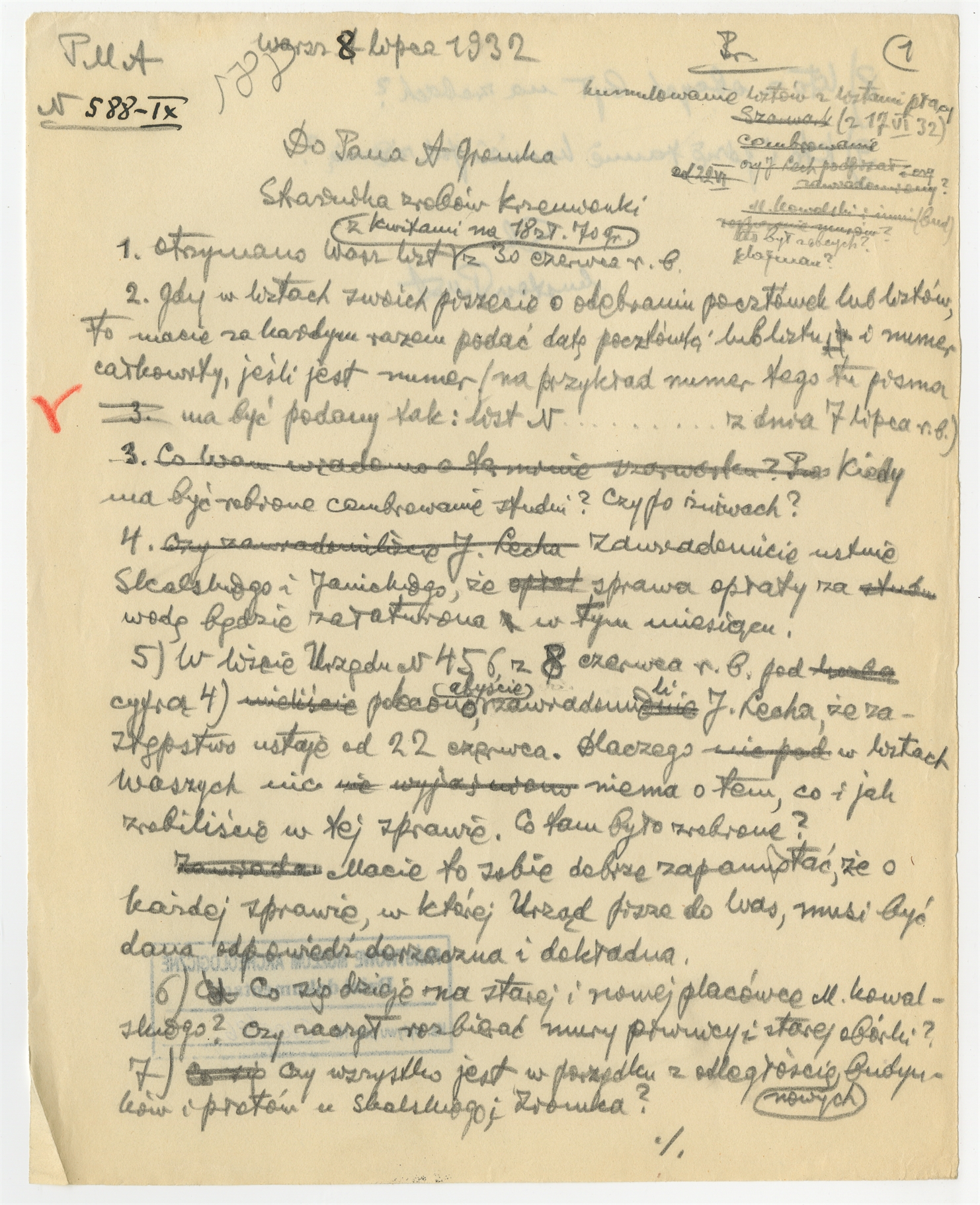 Rękopis-brudnopis pisma prof. Stefana Krukowskiego do Pana A. Gromka z dnia 8 lipca 1932 r.